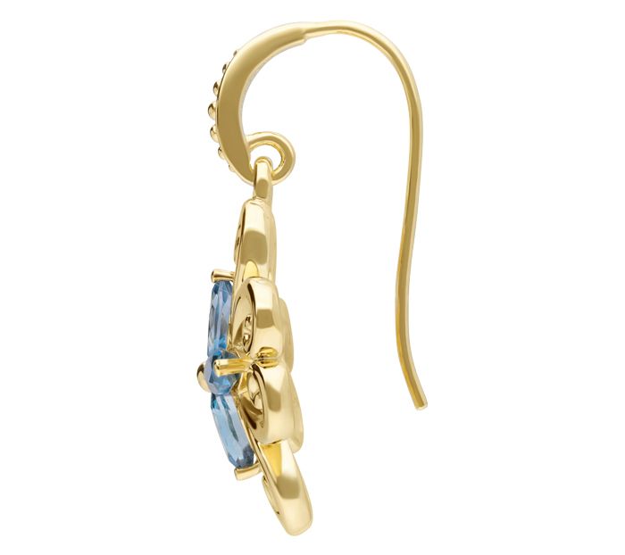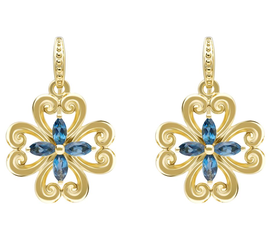- Scrolls form four petals with London blue topaz marquise-cut stones in center; beaded detail on shepherds hook