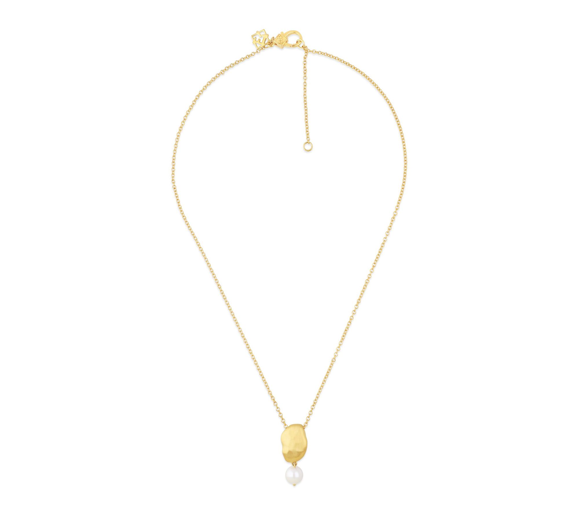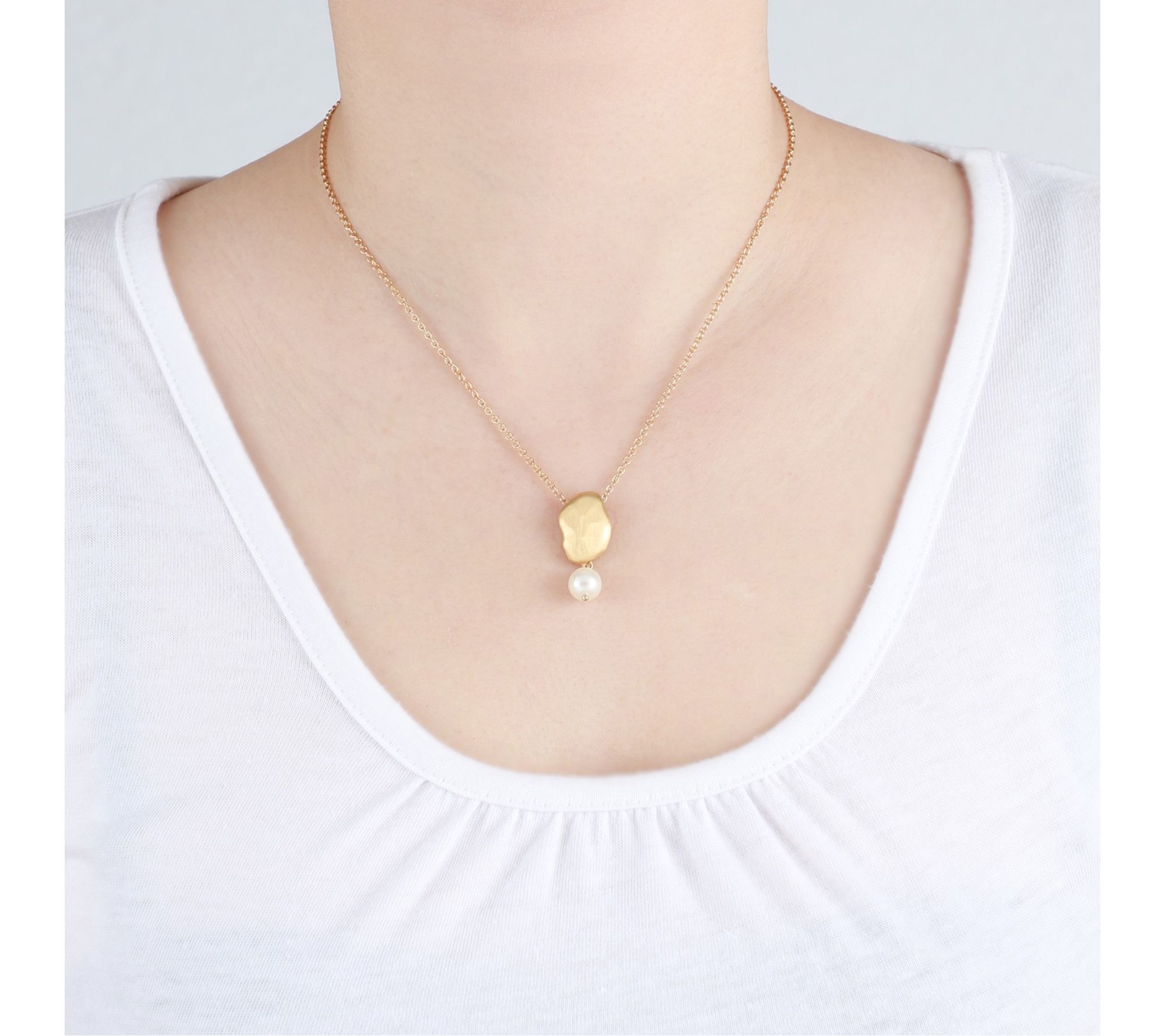 Grace your neckline with this 14K gold-clad sterling silver drop necklace, where an 8mm cultured freshwater pearl gently sways from an artfully brushed, free-form oval. The cable link chain and lustrous accents bring a refined glow to a favorite dress or elevate your everyday ensemble. From Elyse Ryan.