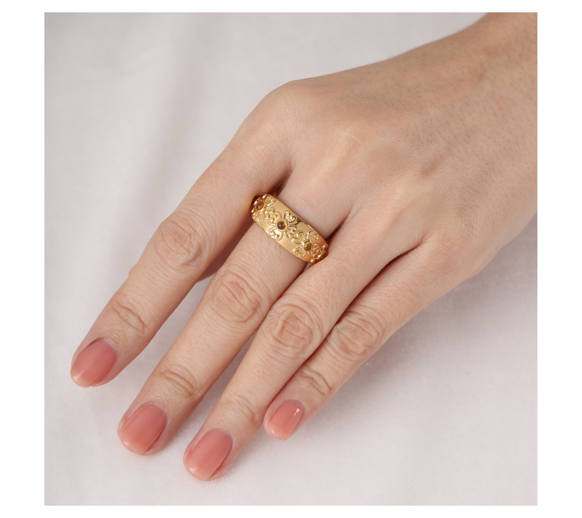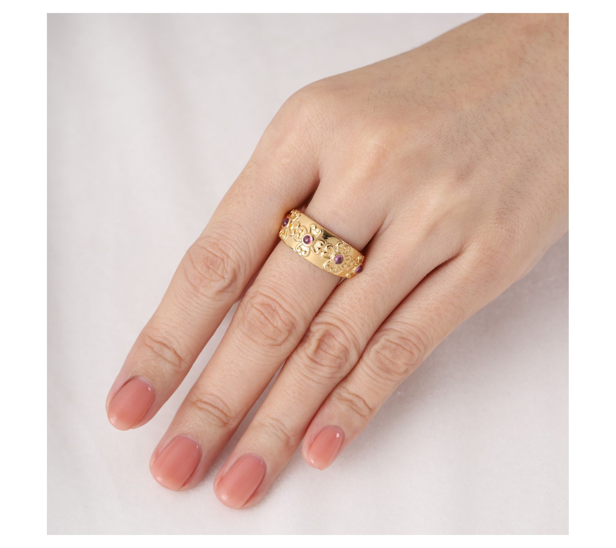 Color your world with this delightful 14K gold-clad gemstone heart band ring from Elyse Ryan. Featuring four heart motifs surrounding your choice of a vibrant citrine or rhodolite gemstone, this ring adds a touch of romance to any outfit. Perfect for any occasion or just because, this charming ring is sure to become a favorite in your collection. From Elyse Ryan.