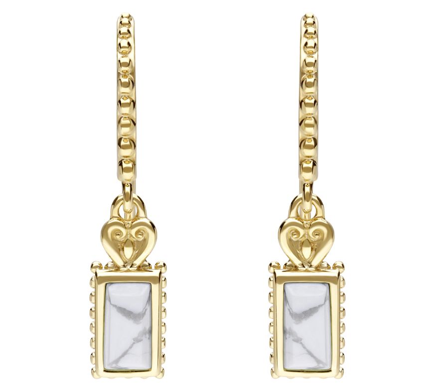 An ornate heart detail is paired with rectangular magnesite stones to lend exotic flair to these style-right earrings. From Elyse Ryan.