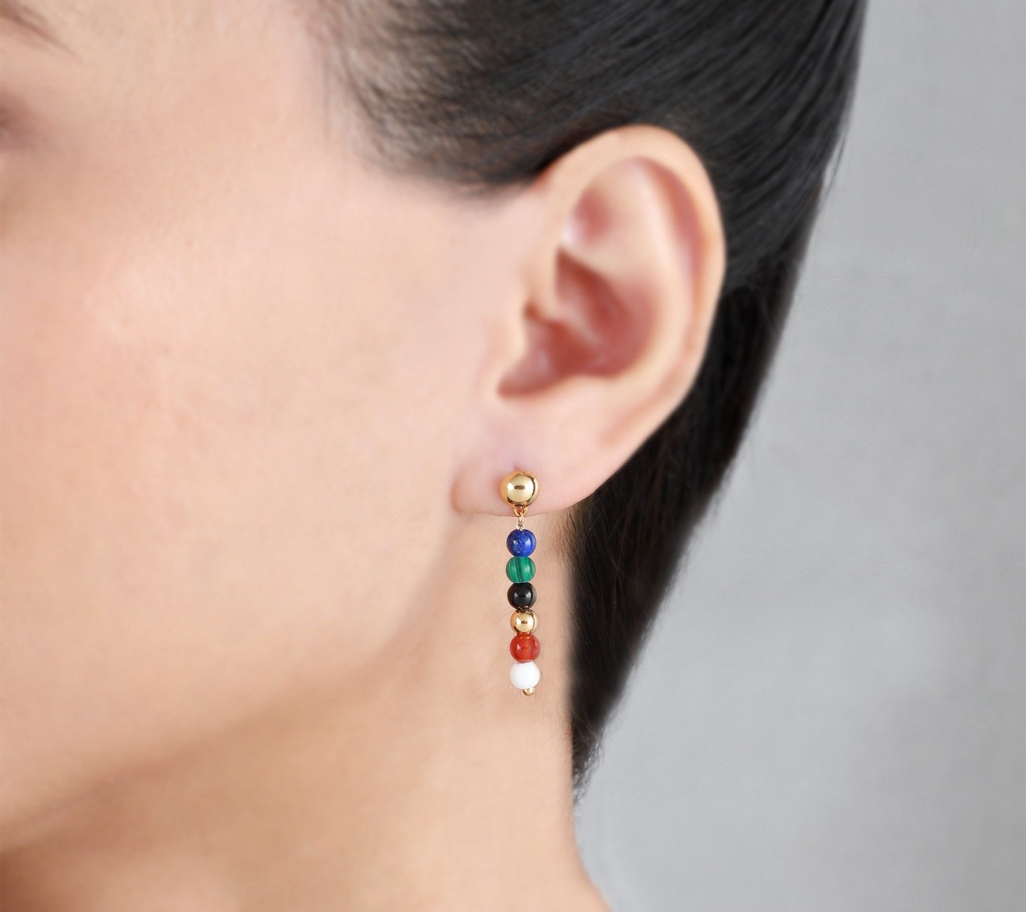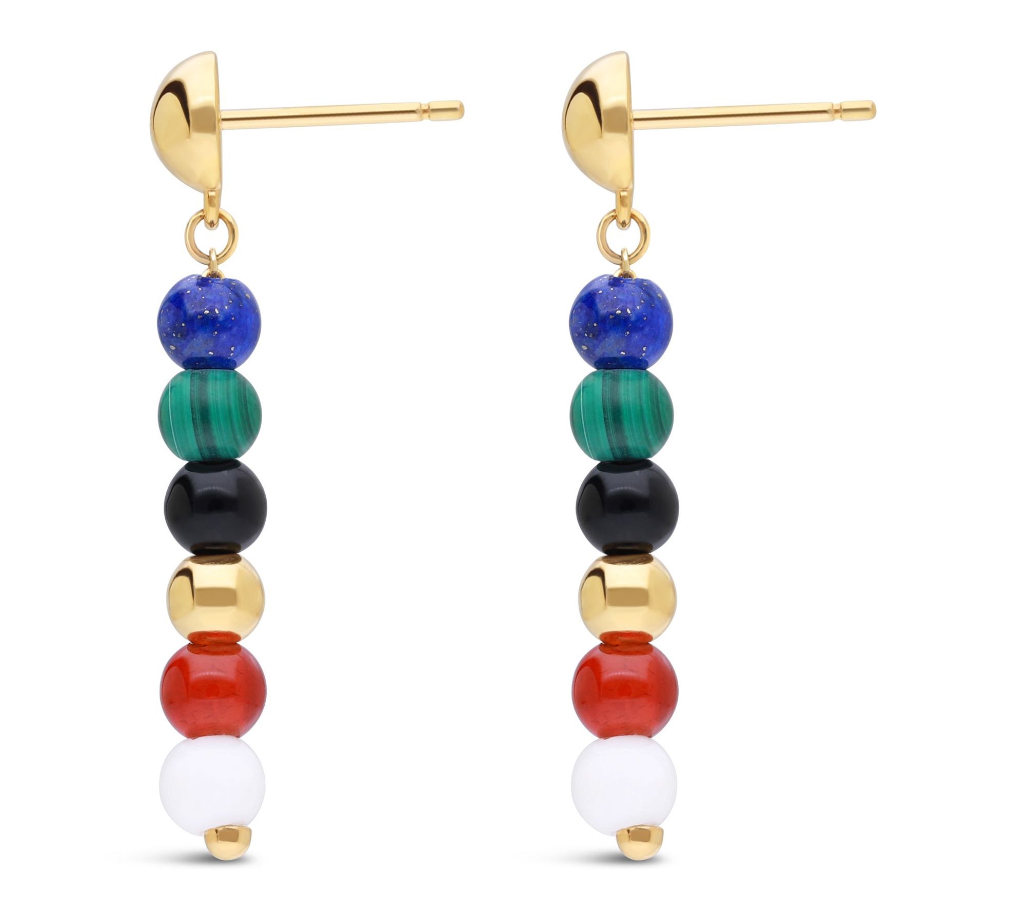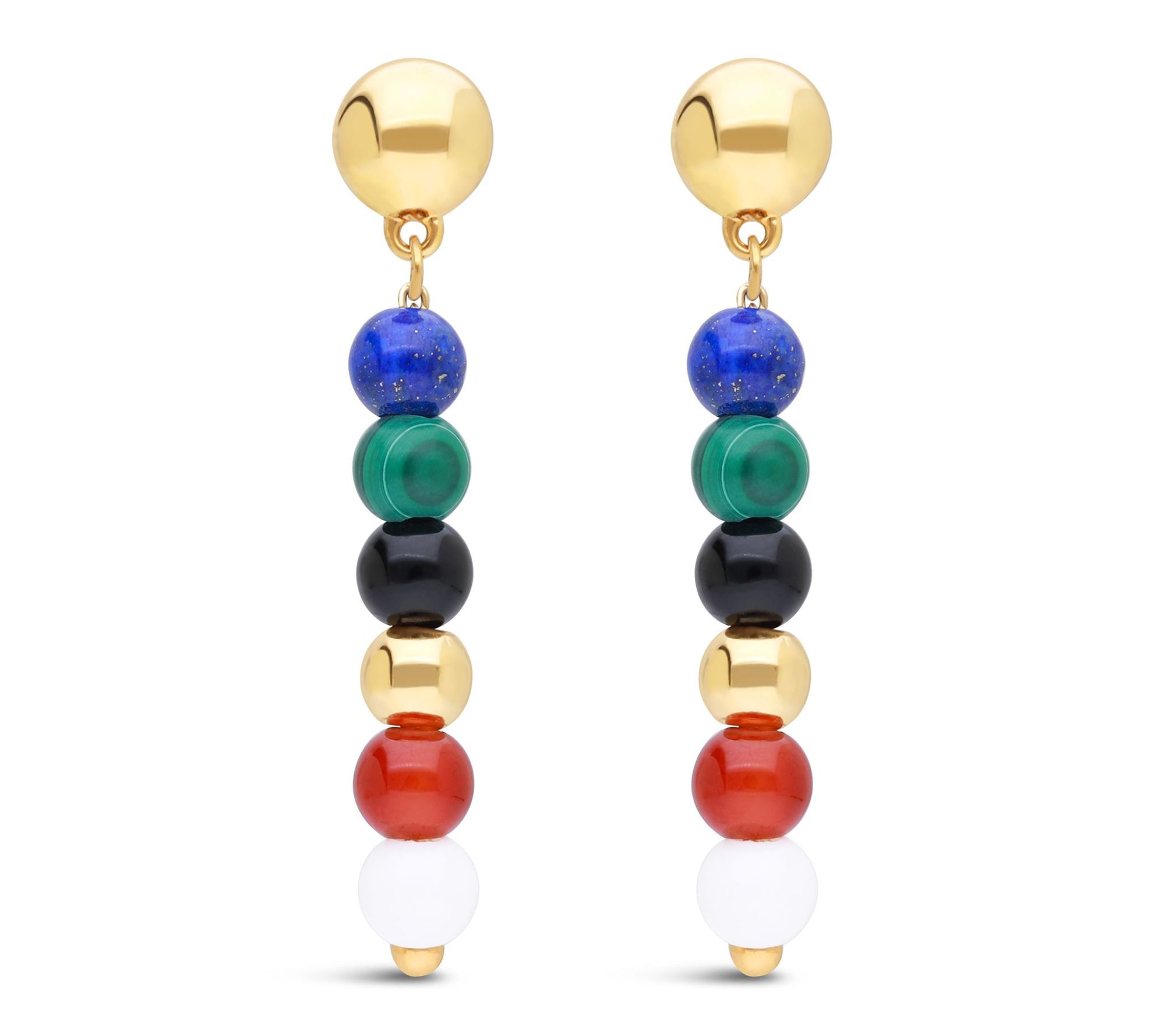 • Dangle design; 4mm round carnelian, lapis, malachite, black onyx, and white agate gemstone beads; wire-set multi-stone beads dangle from a 14K yellow gold-clad bead