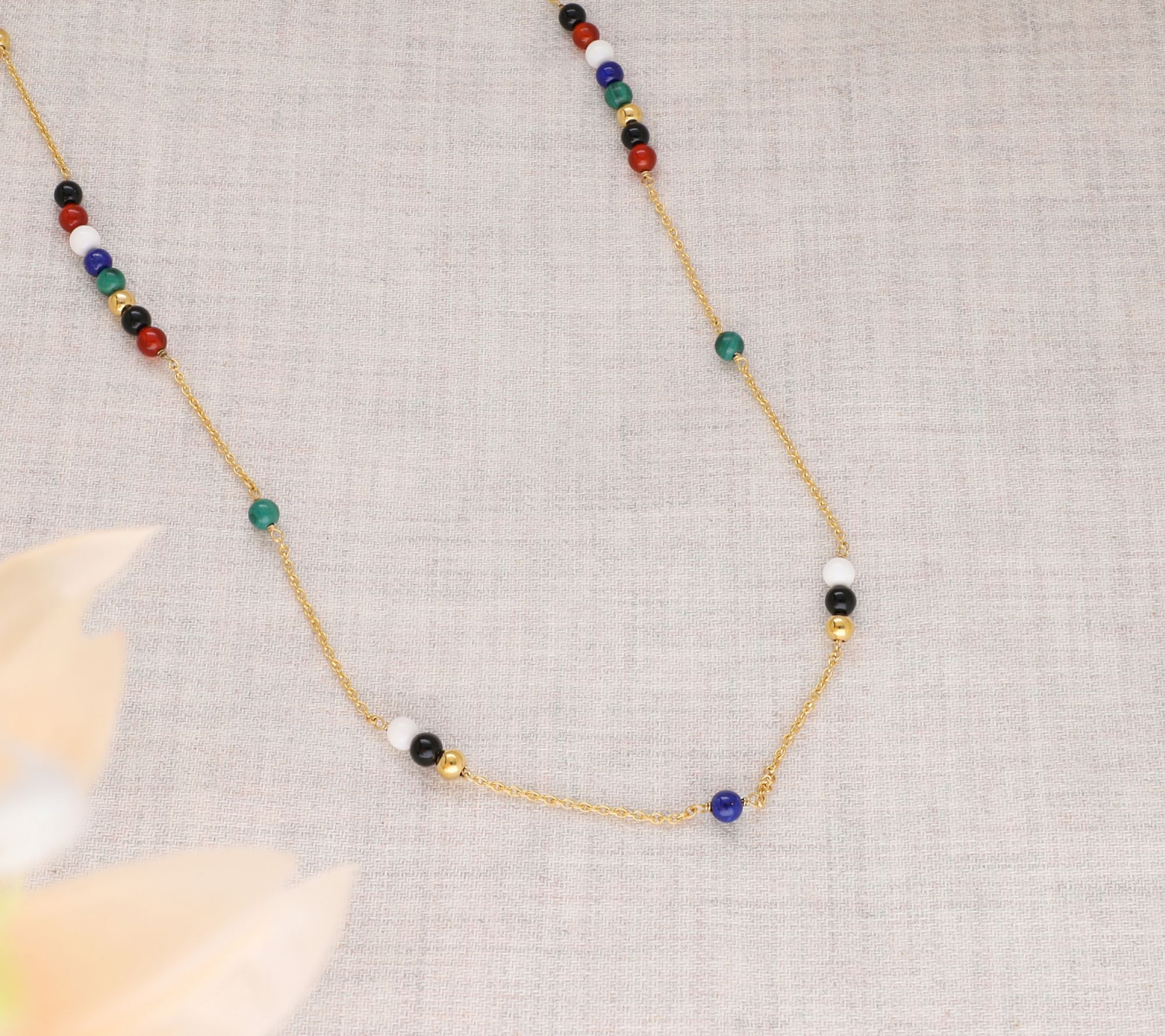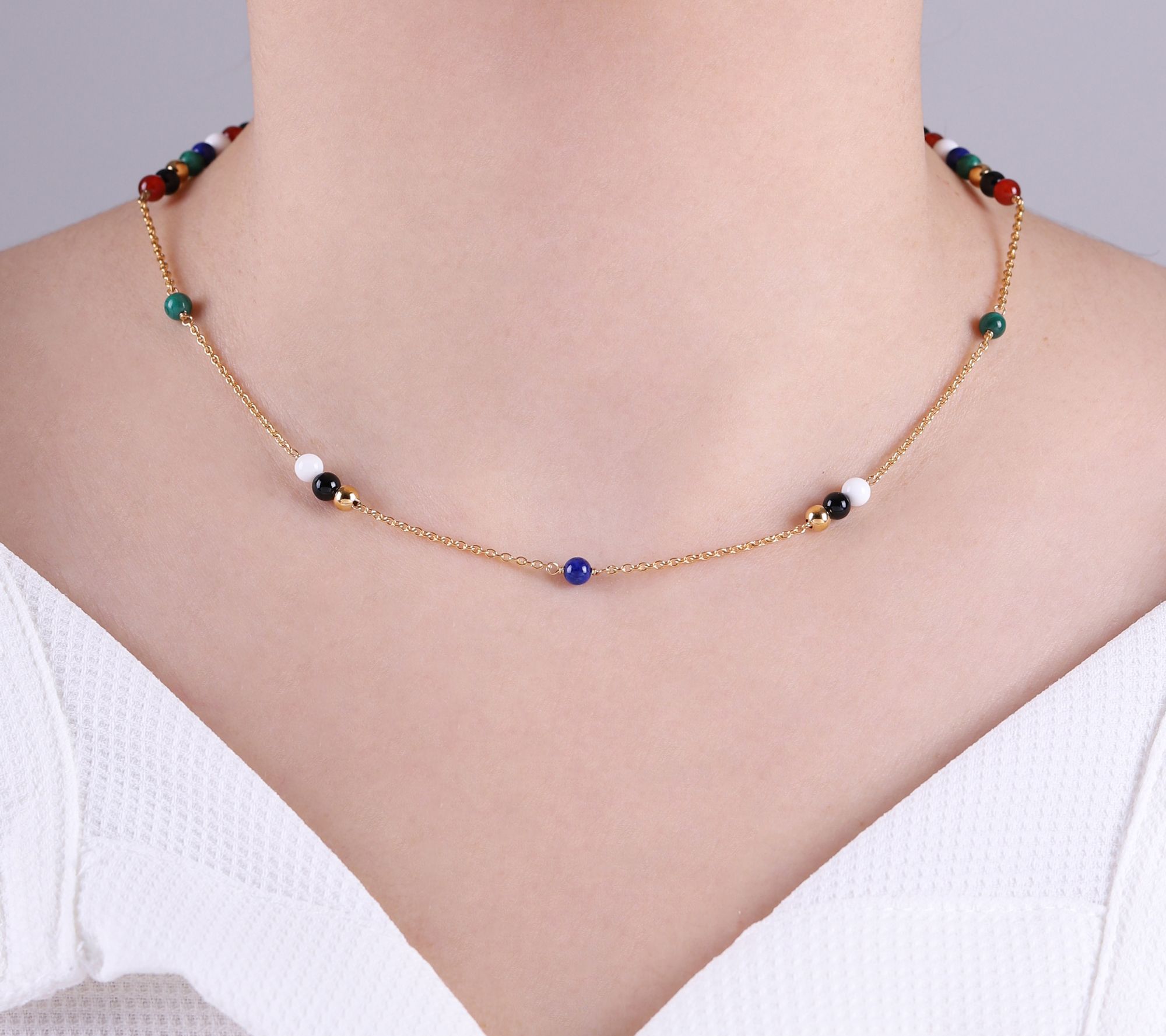 Add some vibrant color to your everyday outfits with this Elyse Ryan Multi-Gemstone Bead Dottie Necklace, a mesmerizing mix of carnelian, lapis, malachite, black onyx, and white agate beads. From Elyse Ryan.