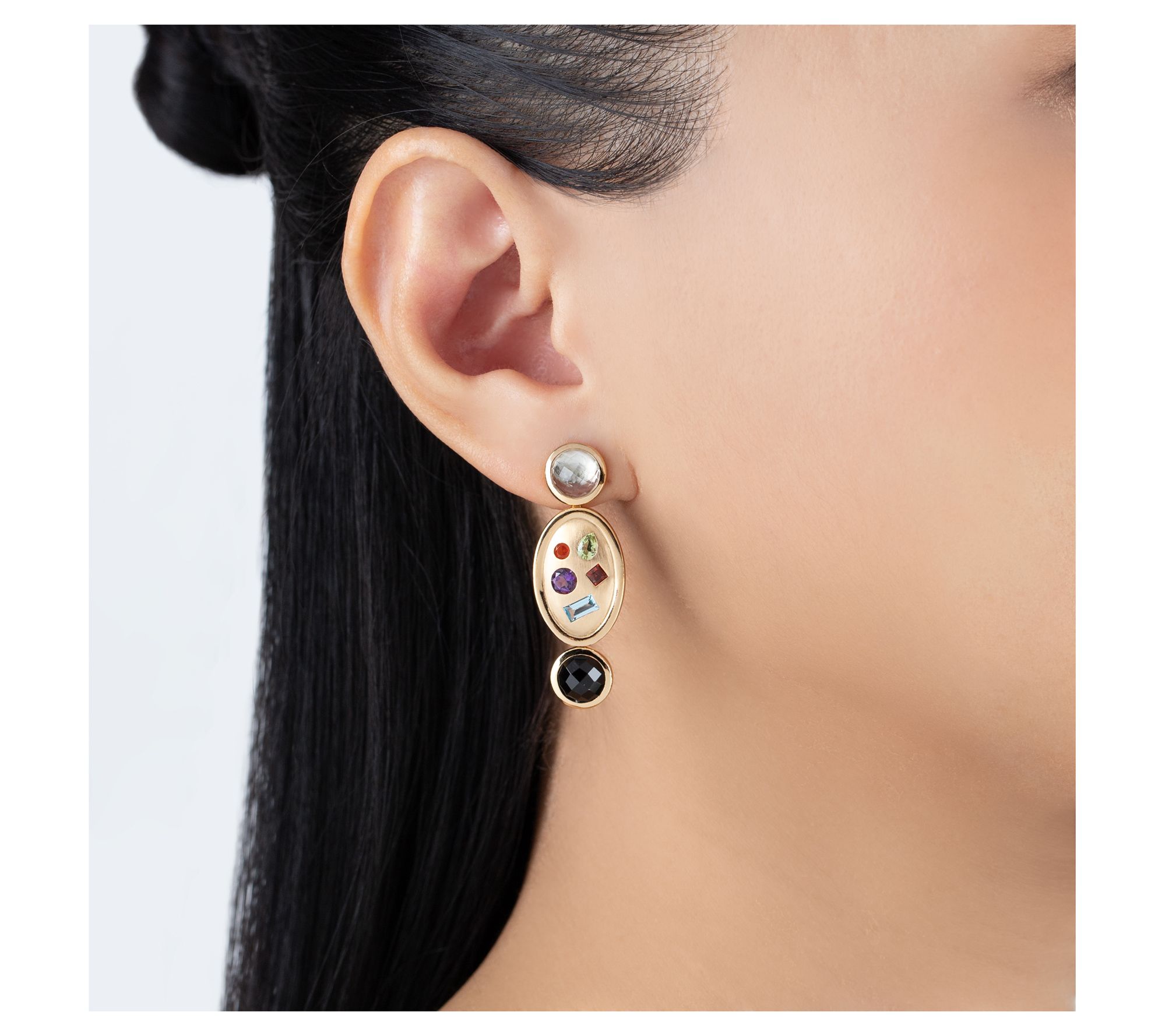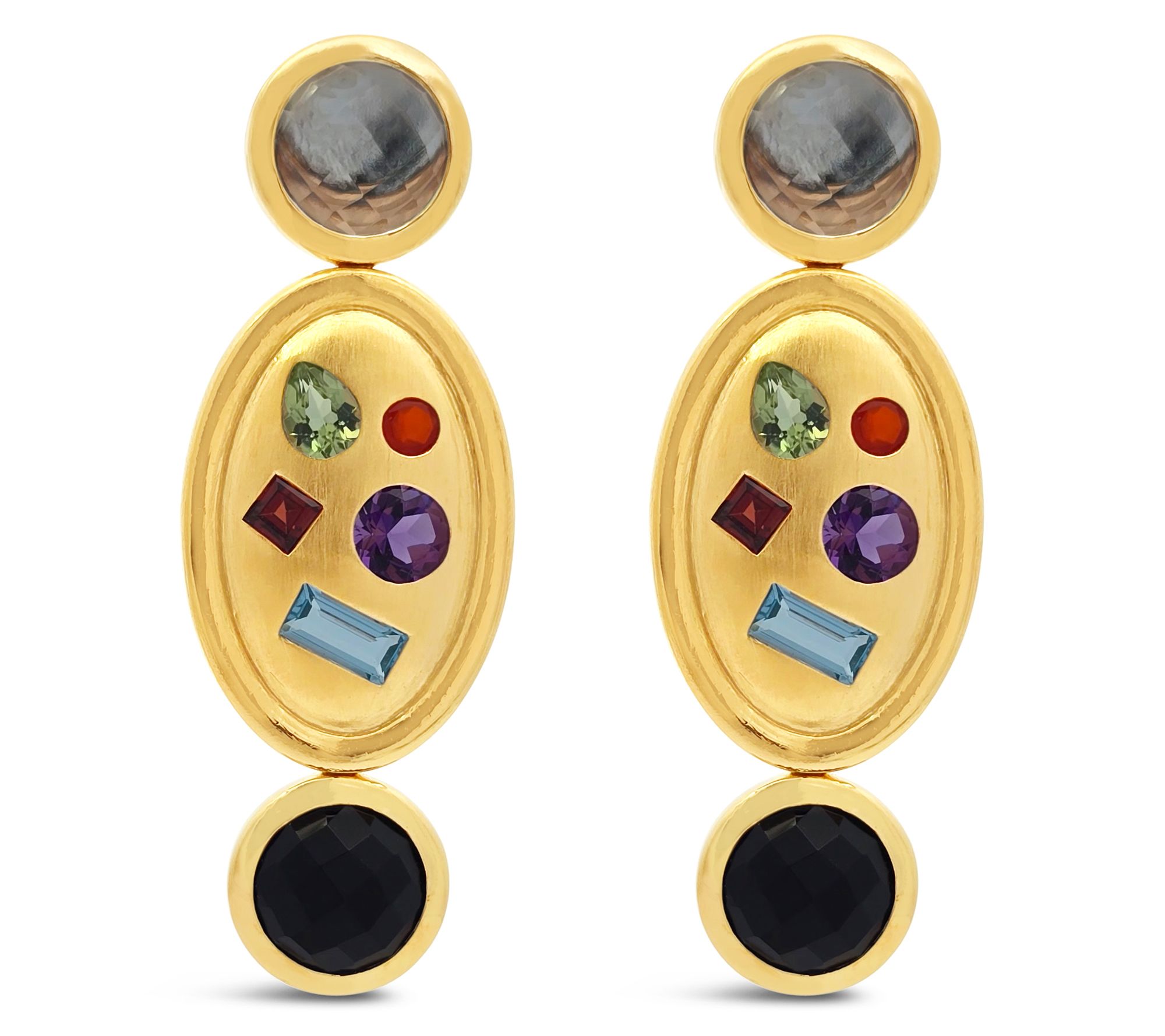Dangling design; round, bezel-set checkerboard-cut white topaz at top; checkerboard-cut black onyx at bottom; pear-shaped peridot; baguette-cut Swiss blue topaz; square garnet; round amethyst and carnelian; hammer/flush and bezel settings