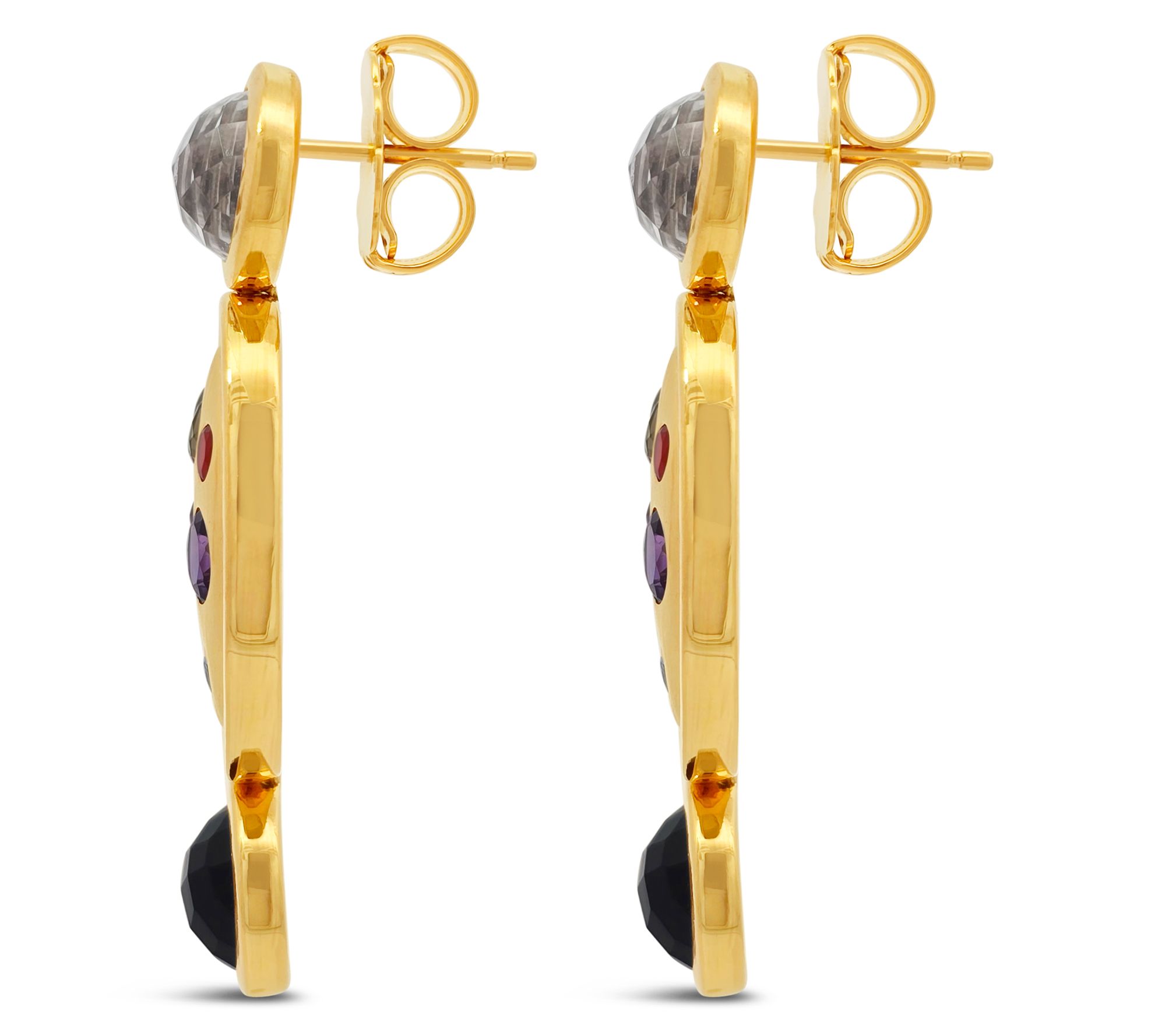 Vivid gems lend major color to every turn, making this pair a conversation starter wherever the day takes you. From brunch with friends to a night out, these dangle earrings add spirited movement and lots of shimmer, thanks to the bright stones and lustrous 14K yellow gold clad finish. From Elyse Ryan.