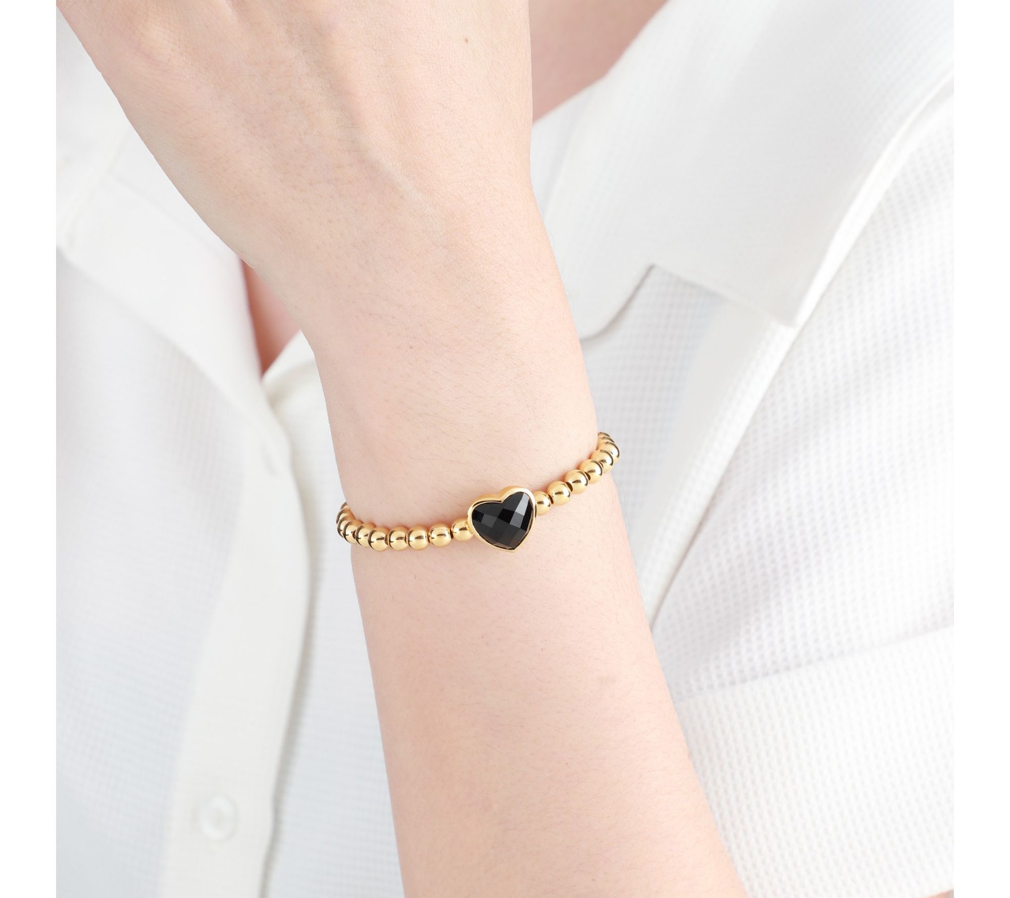 Stretch slip-on design; round beads; bezel-set, faceted black onyx heart in center; signature logo tag