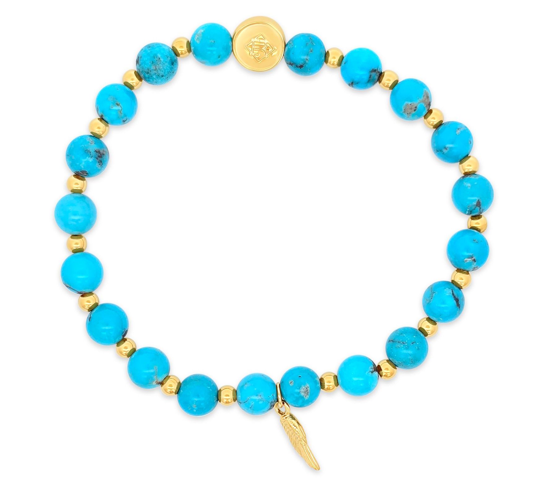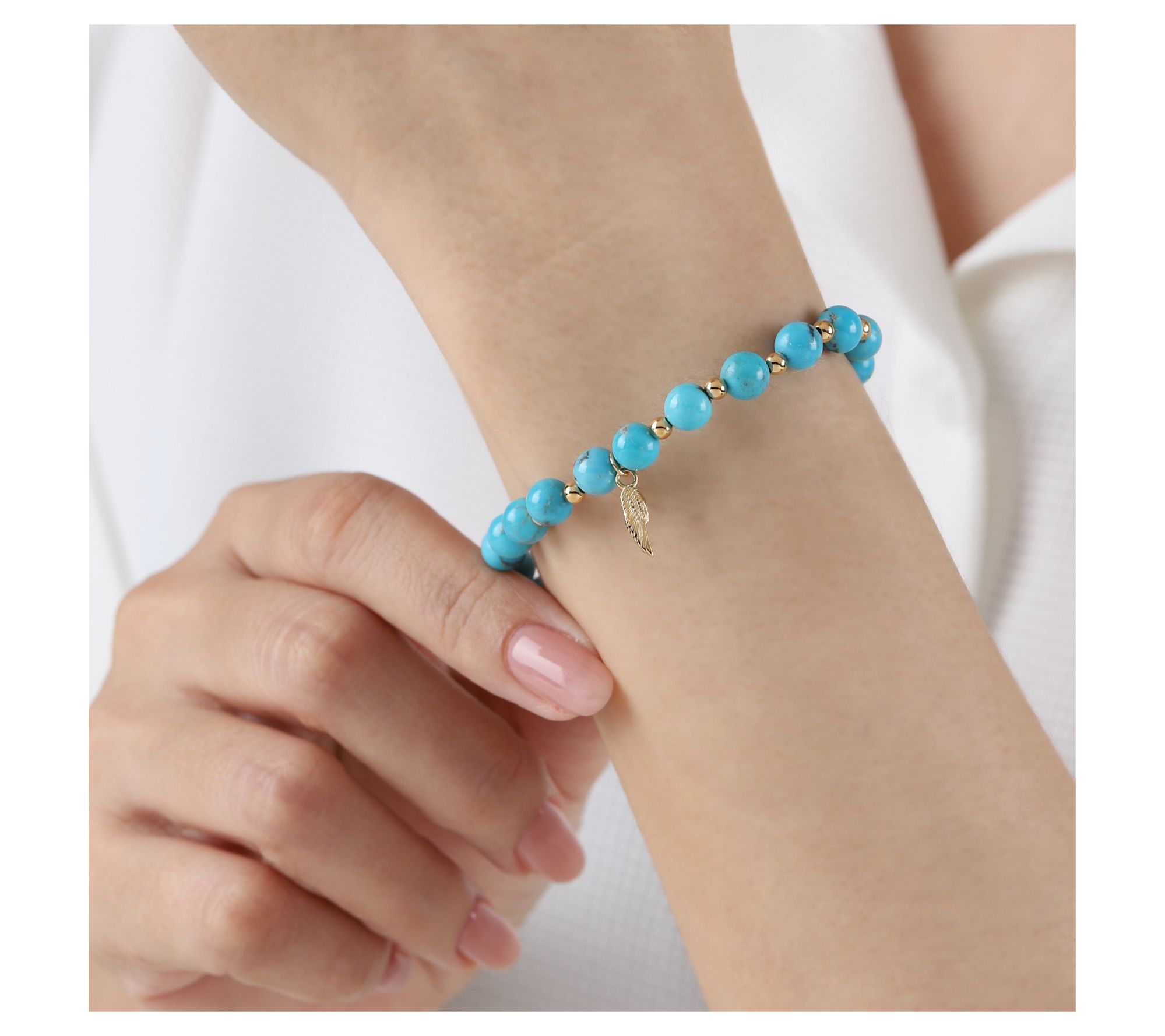 A symbol of inspiration for your everyday style, this turquoise wing charm bracelet adds a pop of color and meaning to both casual outings and special occasions. Blending the cool elegance of turquoise beads with 14K yellow gold-clad details, it invites you to wear hope, strength, and confidence wherever you go. From Elyse Ryan.