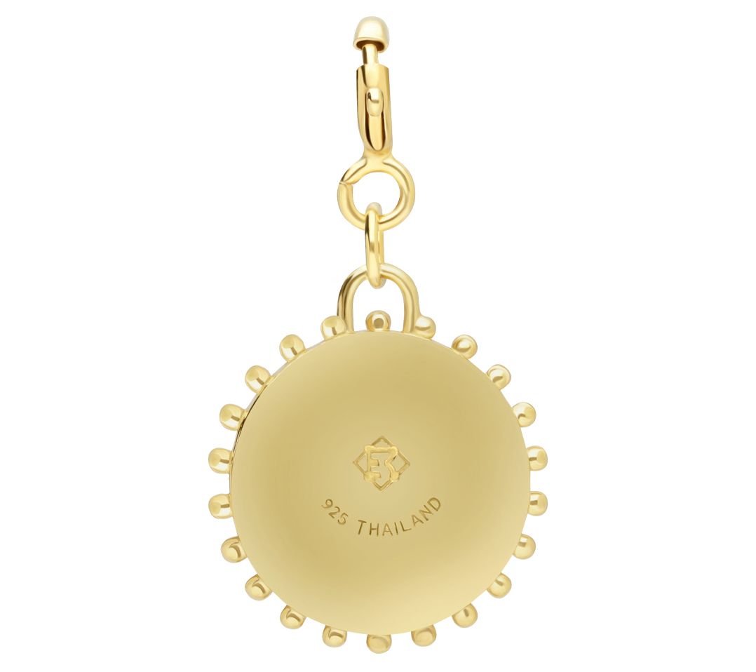 • Pink enamel charm with beaded edges, bezel-set white topaz, and initial