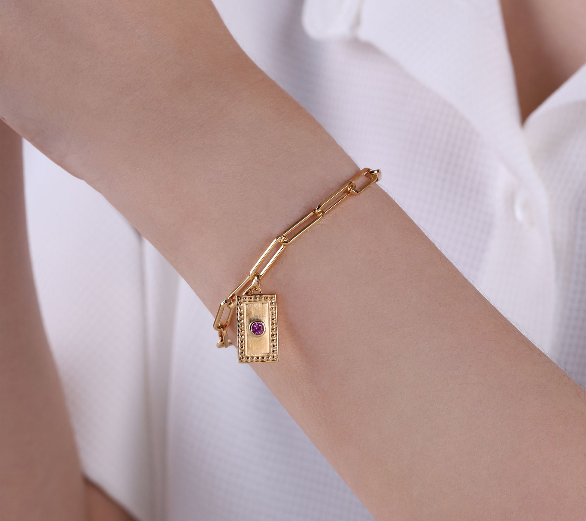 Oval paperclip links; rectangular charm with beaded frame and bezel-set, round gemstone at center