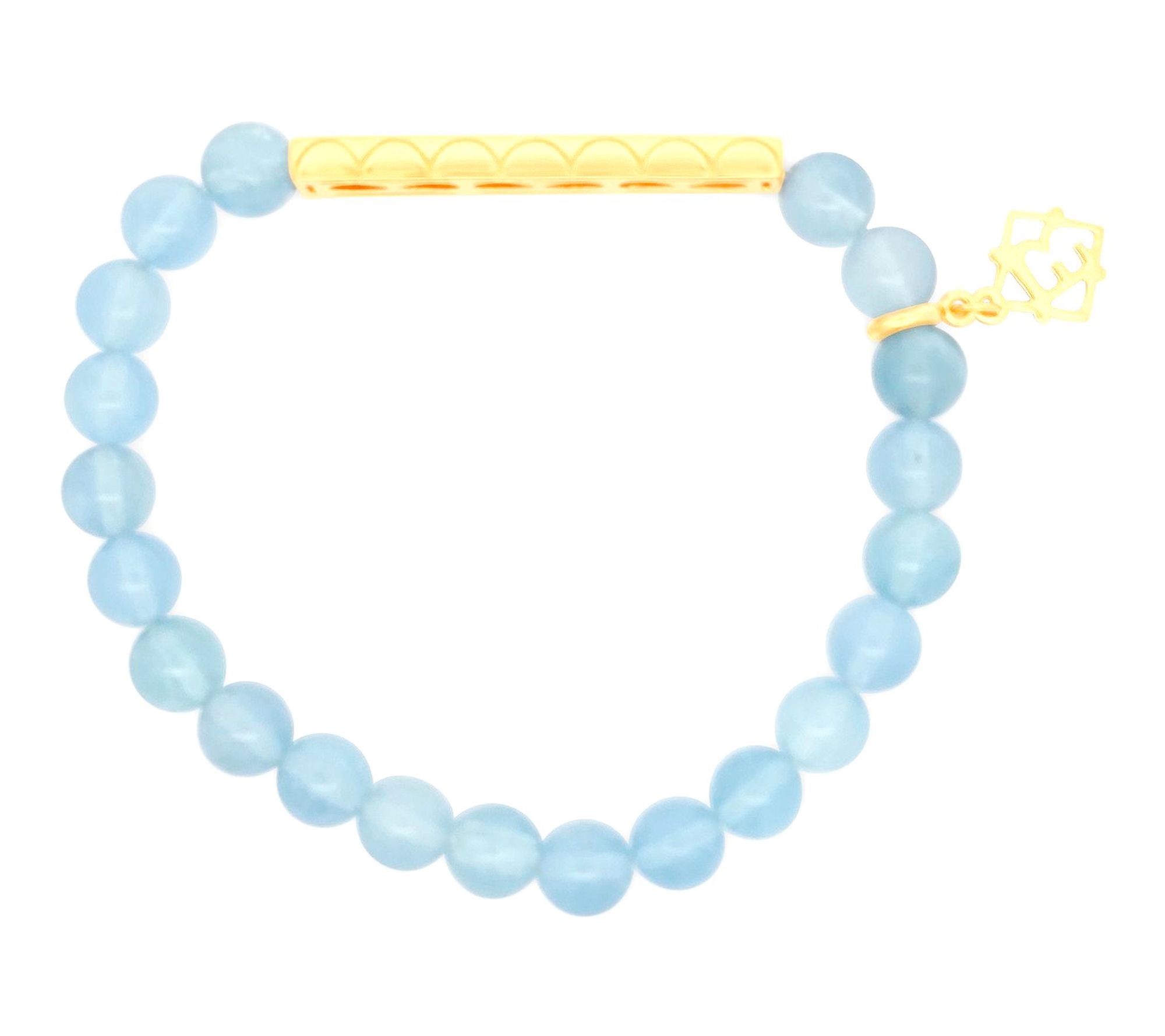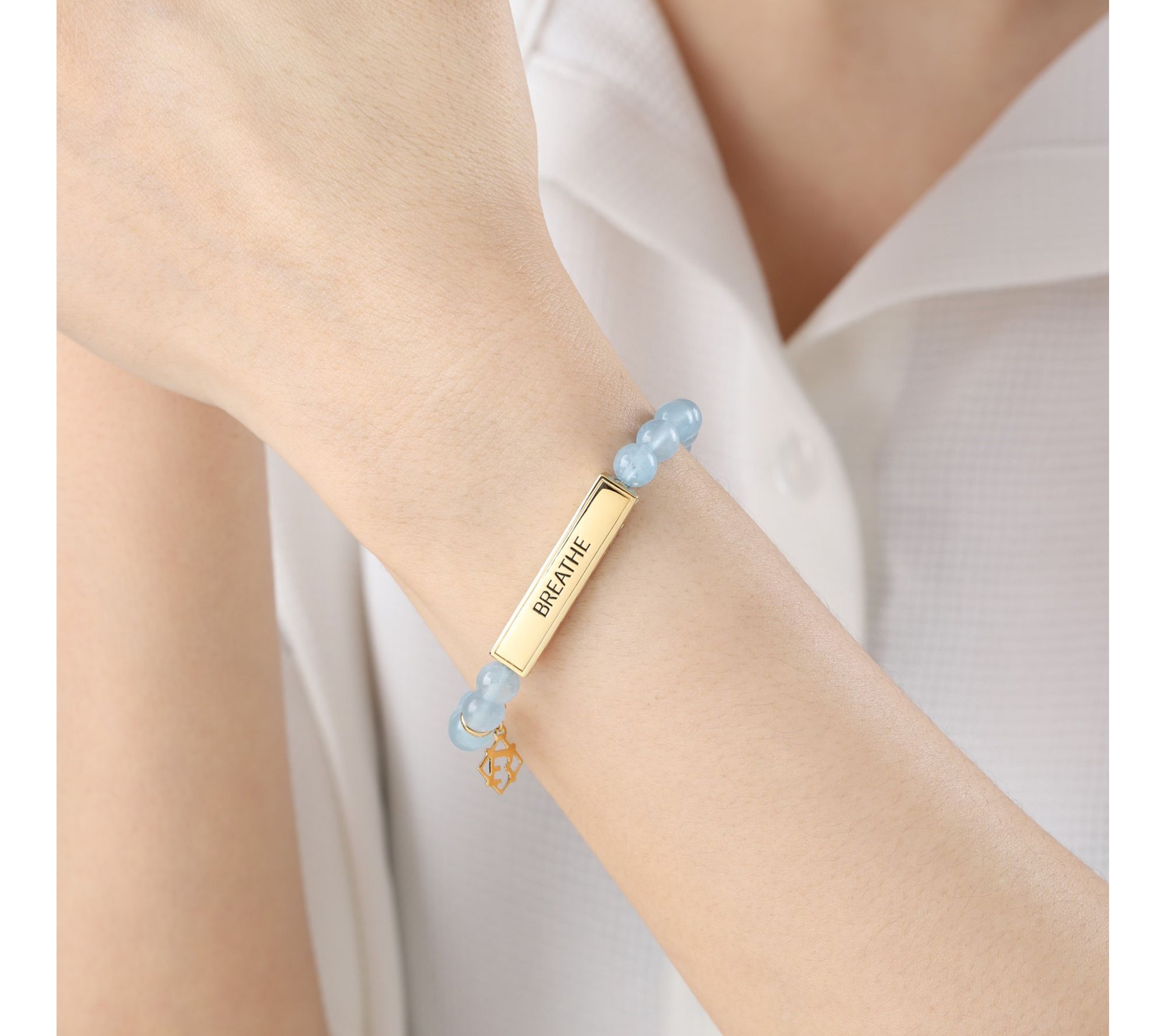 - Stretch design; round milky aqua beads; station with "BREATHE" inscription; logo charm
