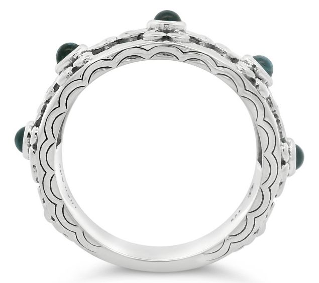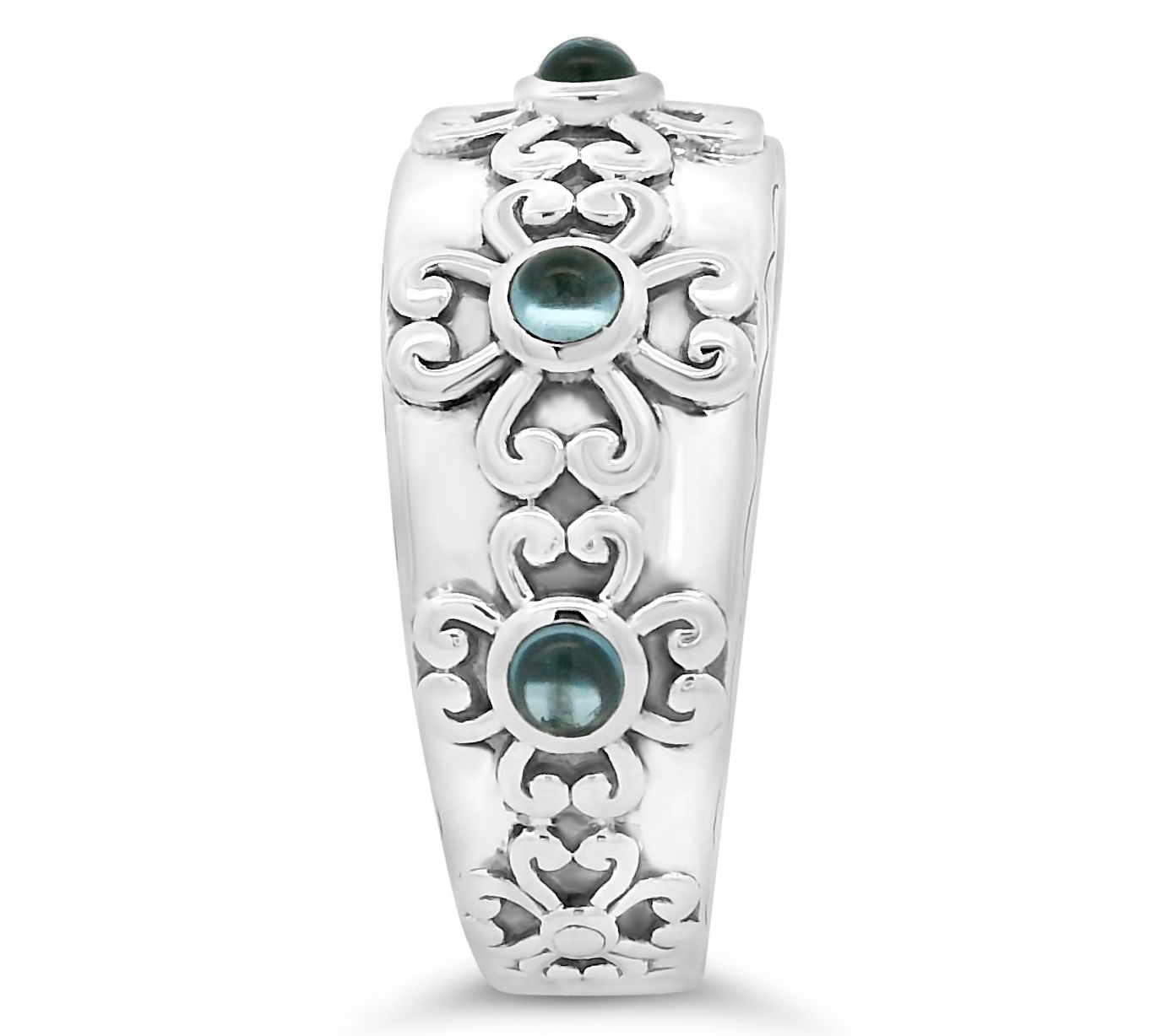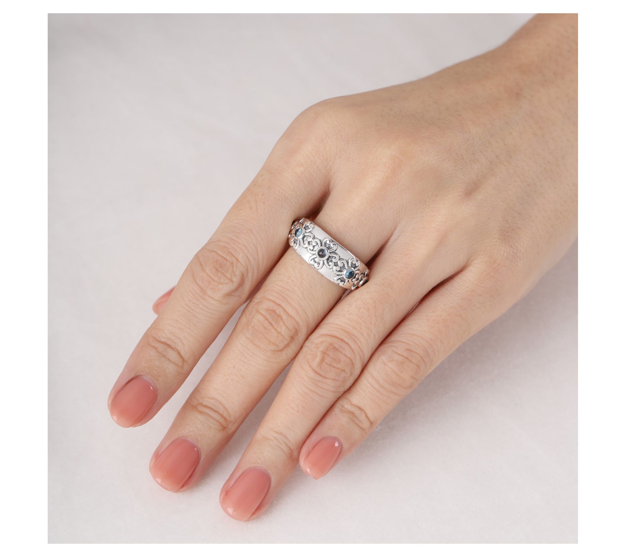 Accentuate your style with the Elyse Ryan sterling silver and London Blue Topaz heart band ring. Four delicate hearts gracefully surround a stunning bezel-set London blue topaz, creating a captivating piece that adds a touch of elegance to any outfit. From Elyse Ryan.