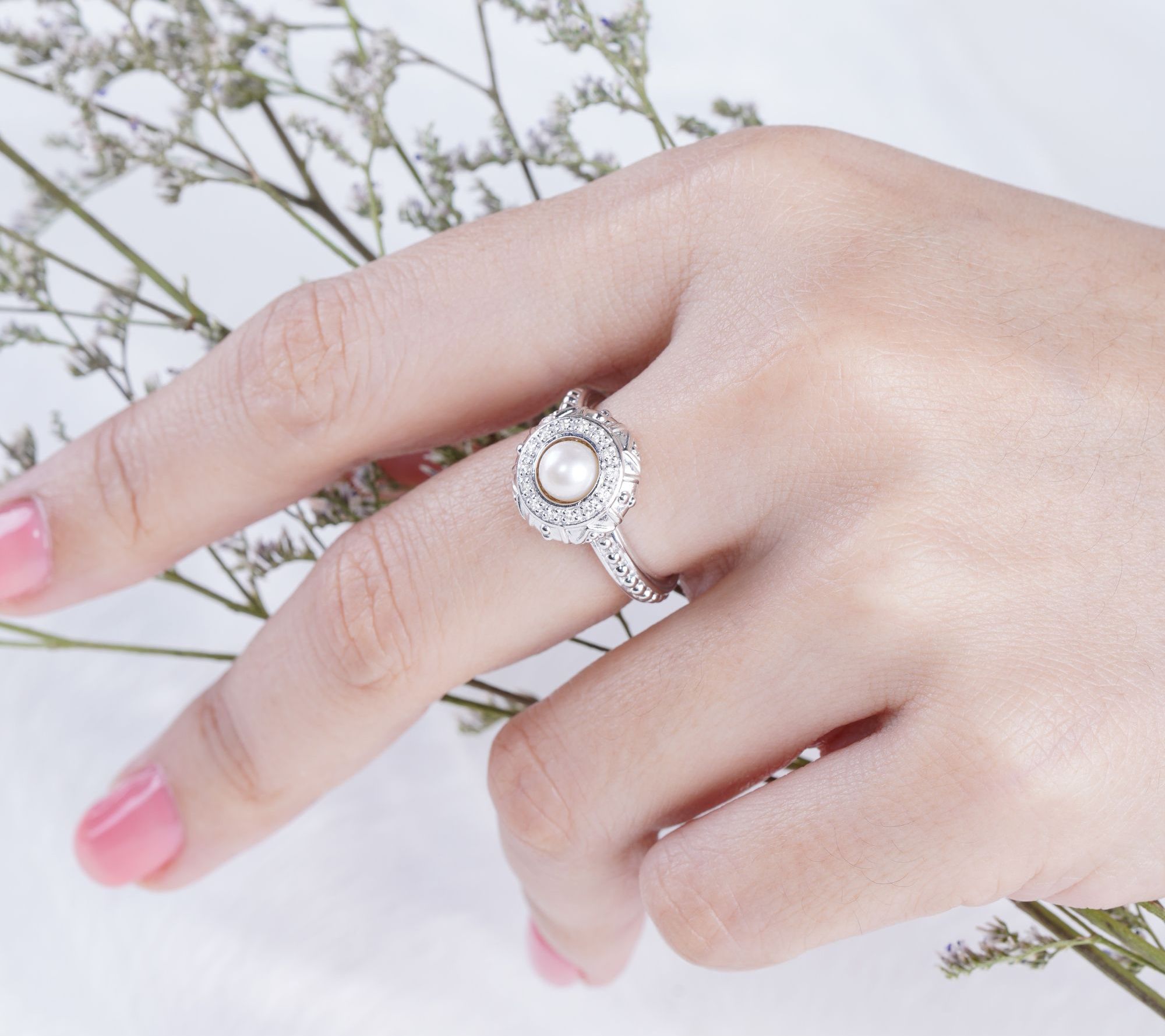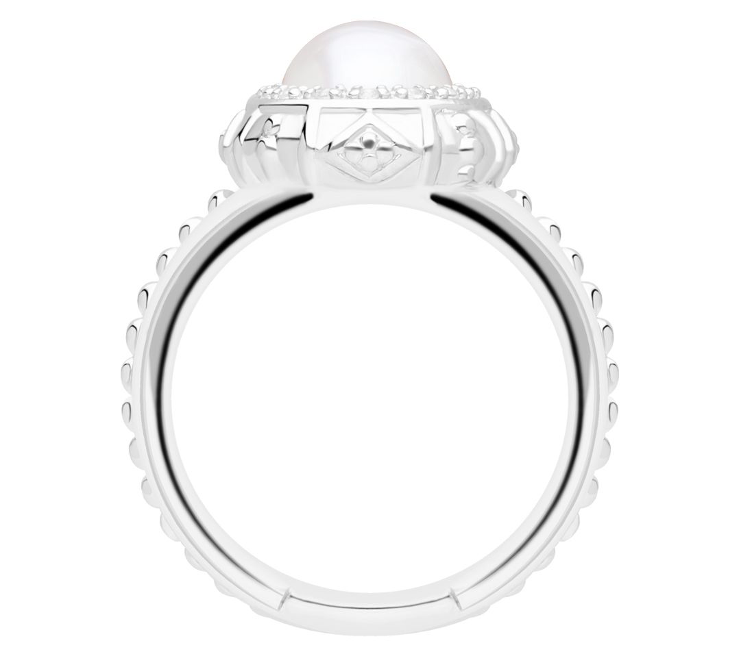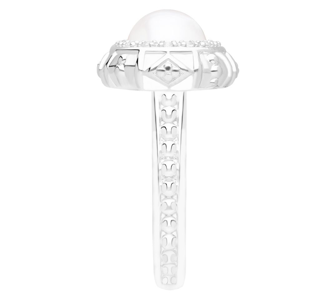 Cultured freshwater pearl with a halo of white topaz stones; bead-textured shank