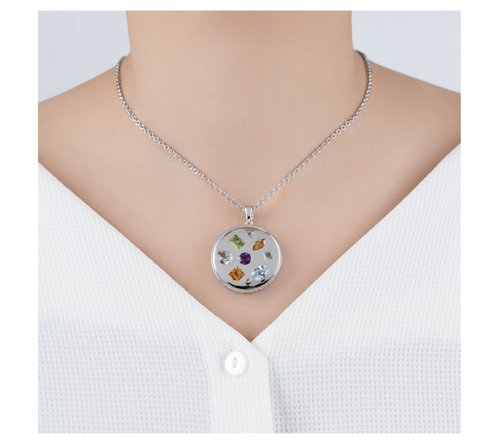 Mix of oval, pear, baguette, and round gemstones set in a high-polished disc; disc slides on chain from high-polished bail