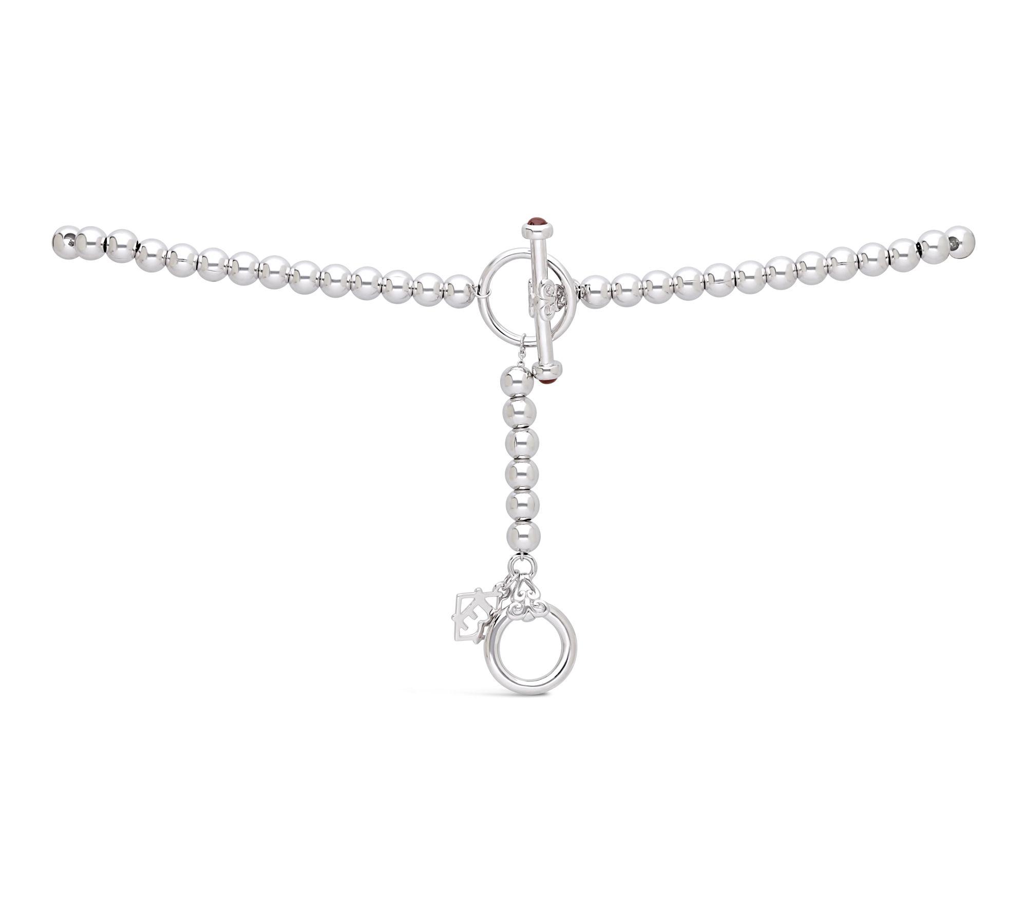 Pave-set white topaz heart pendant; garnet stones set within toggle closure; round stone cut; bezel, pave settings; signature Elyse Ryan logo tag