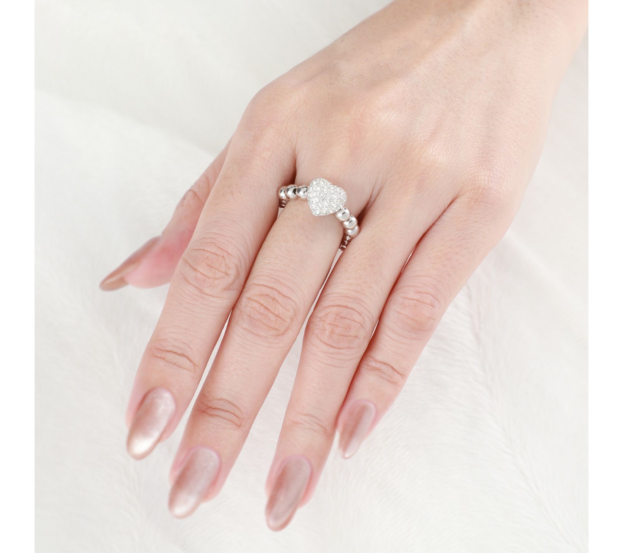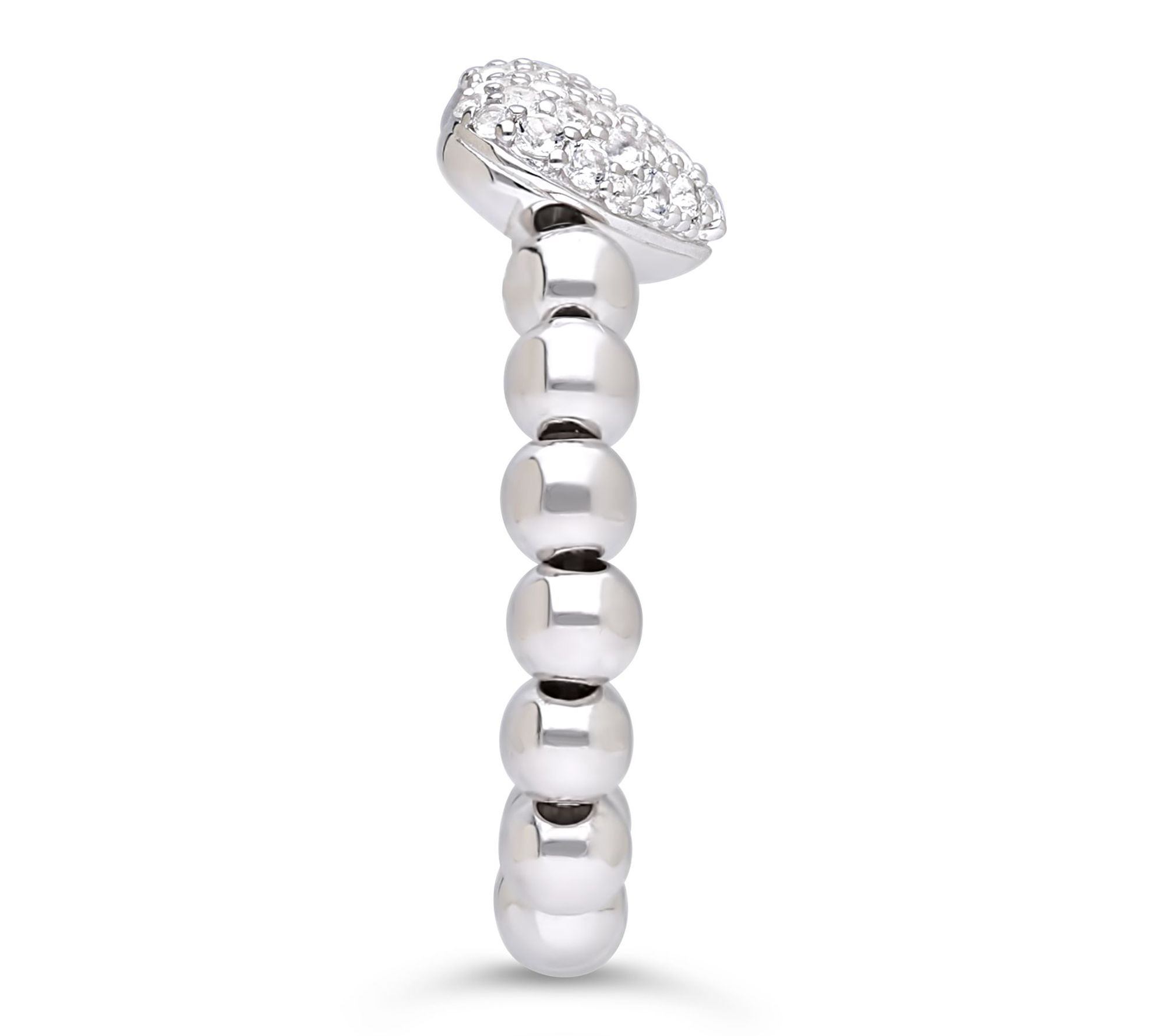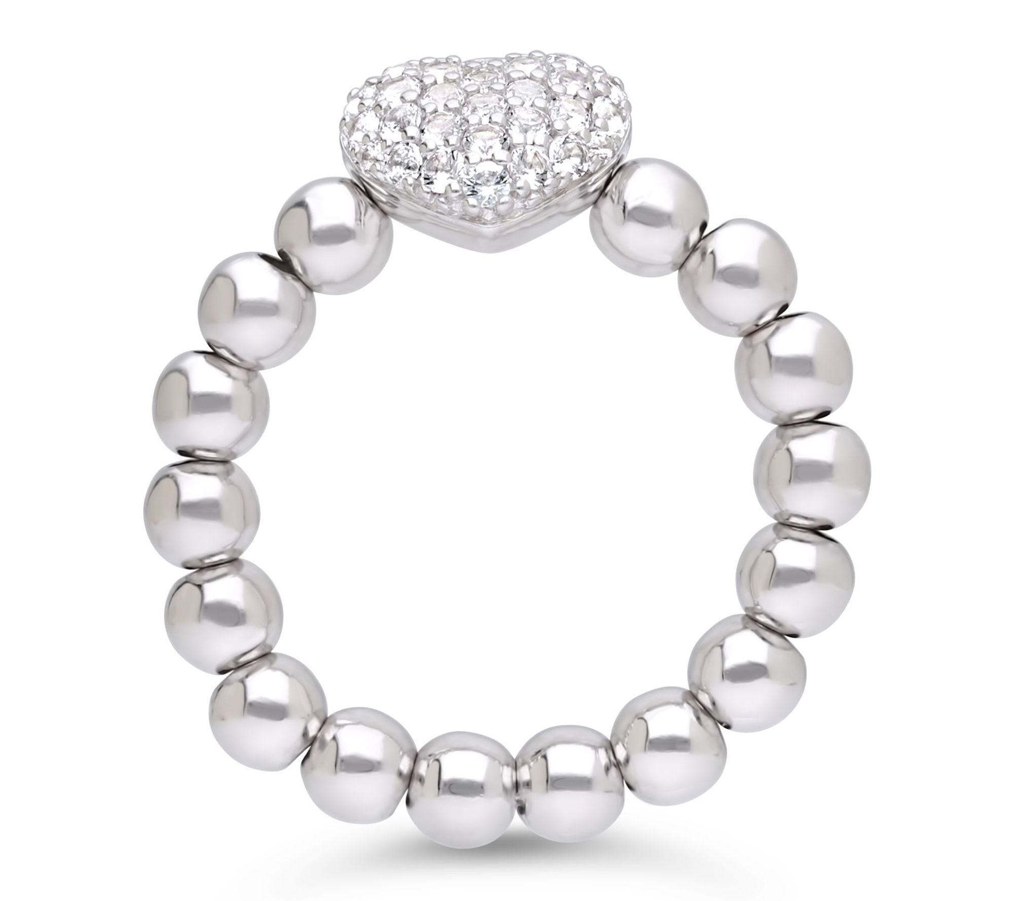 Heart-shaped pave white topaz at center; polished beaded band; split shank design