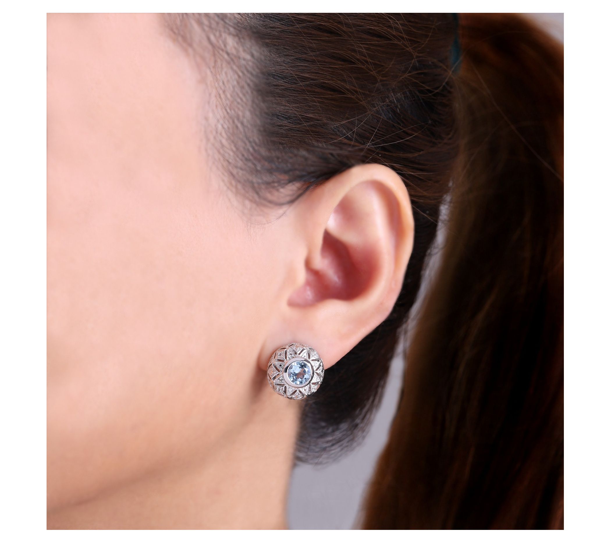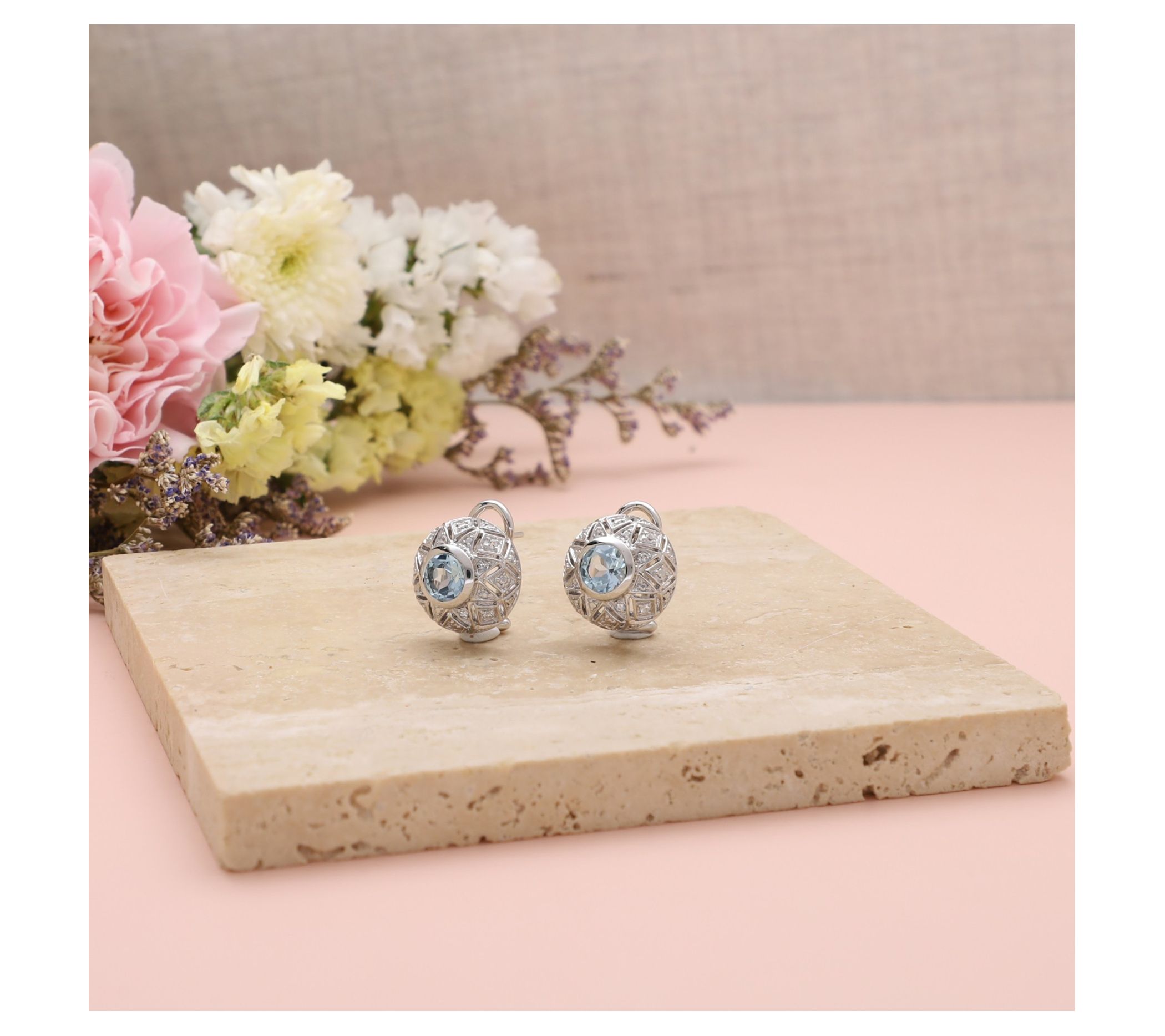 These Cecile button earrings add a sophisticated touch to any outfit, featuring a round bezel-set sky blue topaz at the center surrounded by white topaz accents. From Elyse Ryan.