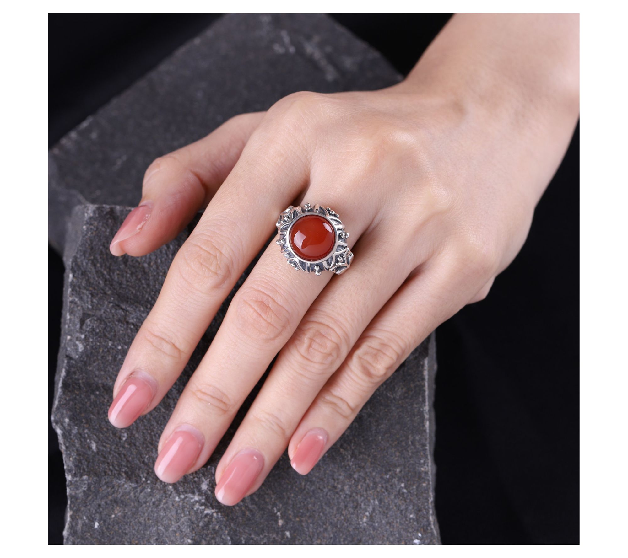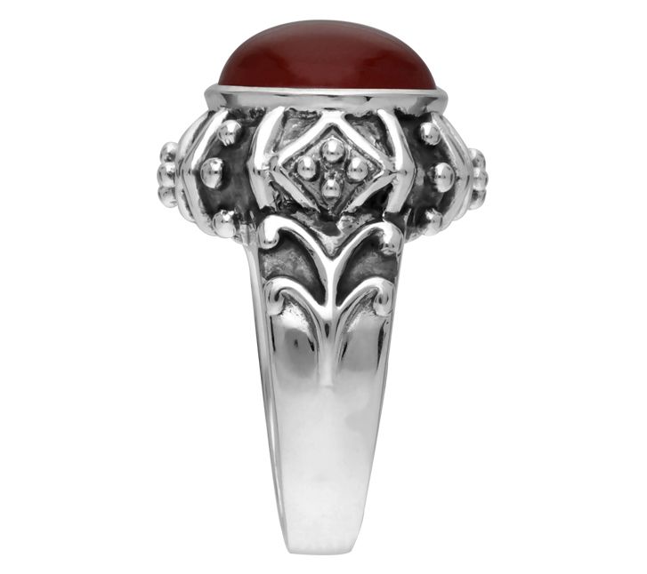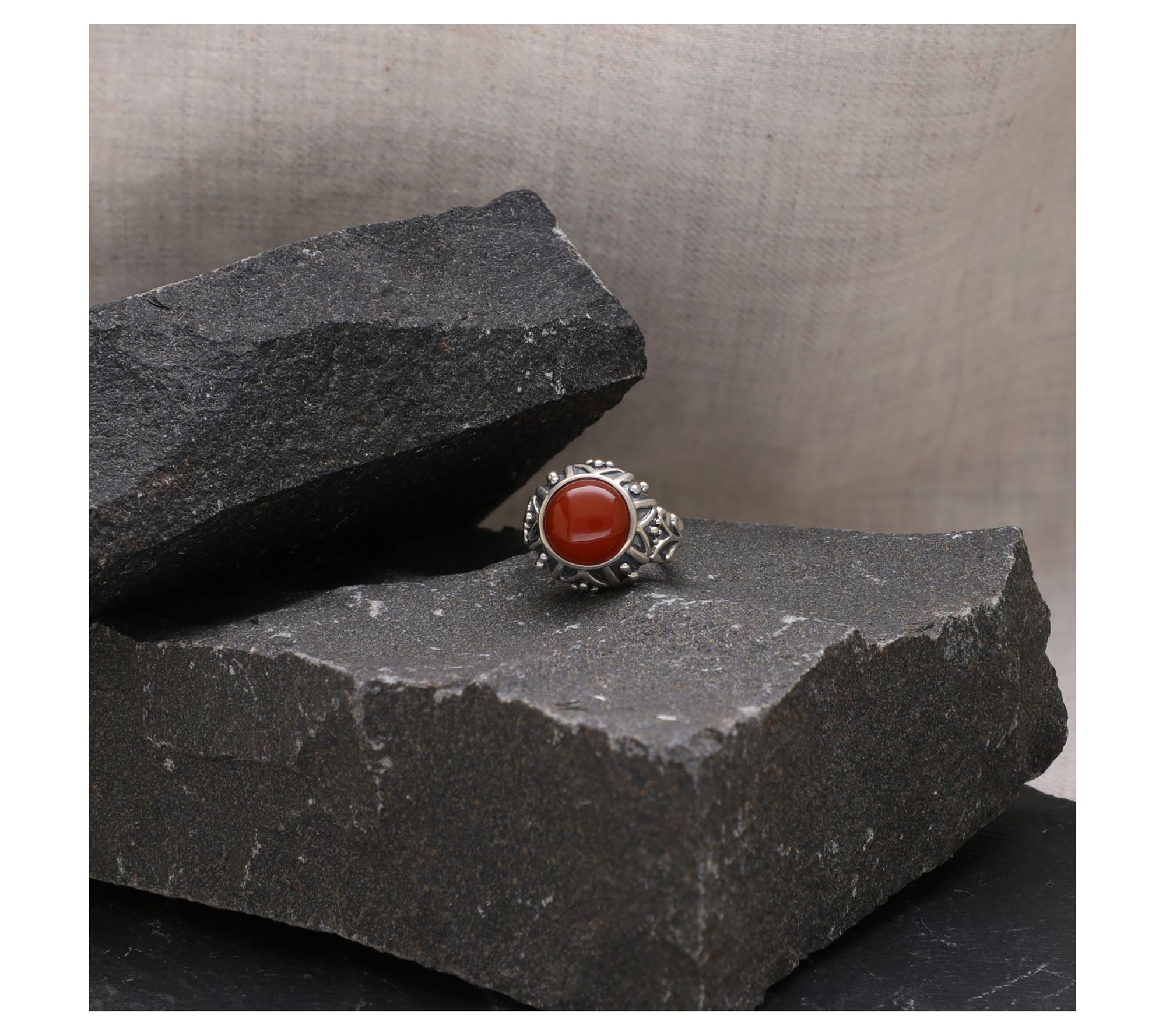 Elevate your jewelry collection with this sterling silver carnelian ring, featuring a beautifully bezel-set round carnelian cabochon. This exquisite piece is framed with a sterling textured motif and boasts a tapered shank, making it a standout addition to any ensemble. From Elyse Ryan.