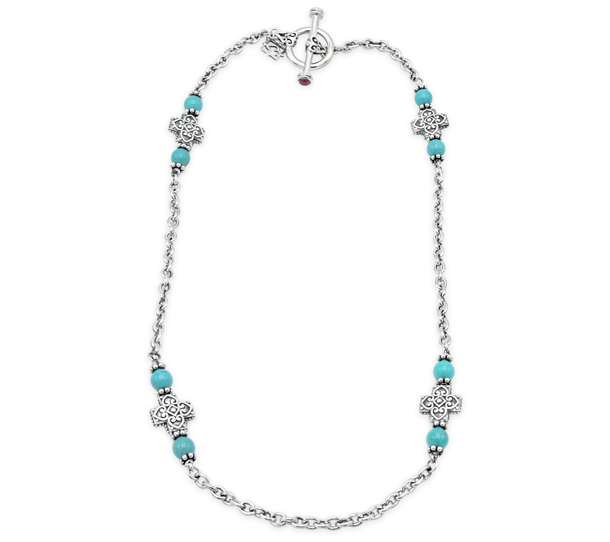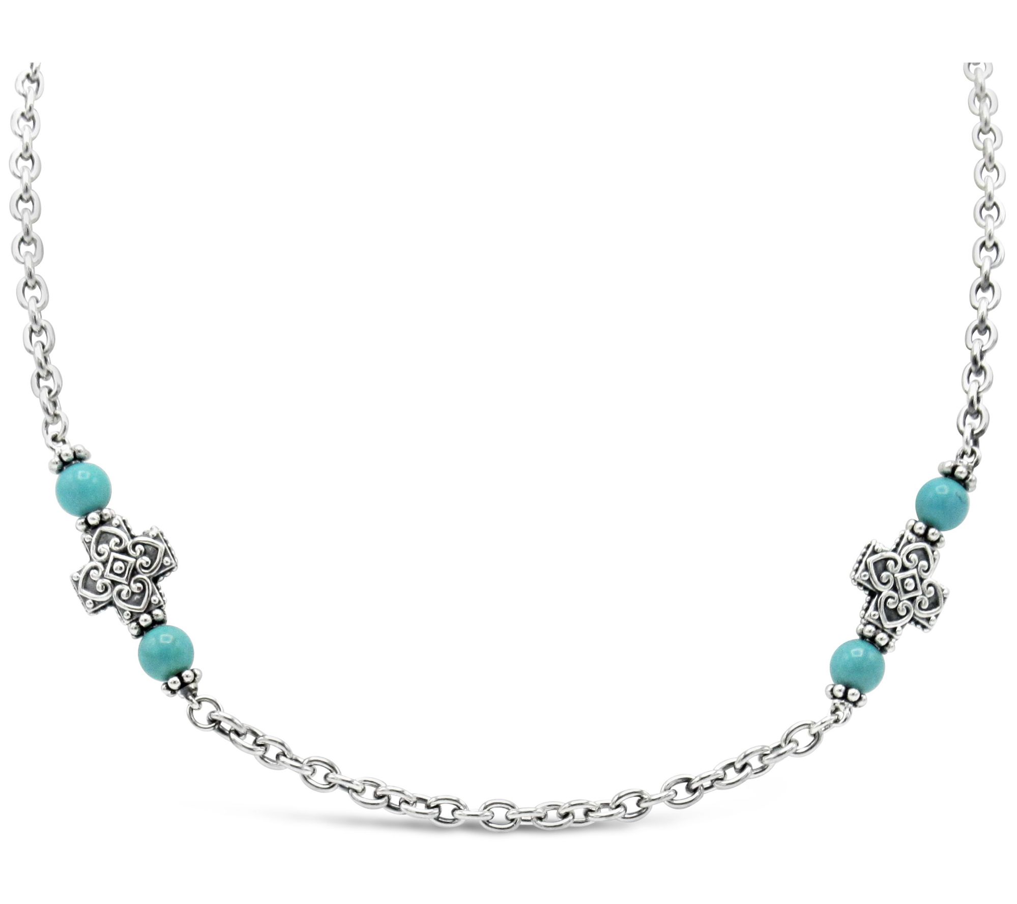 • Polished oval link chain with four scroll textured cross stations between two turquoise beads