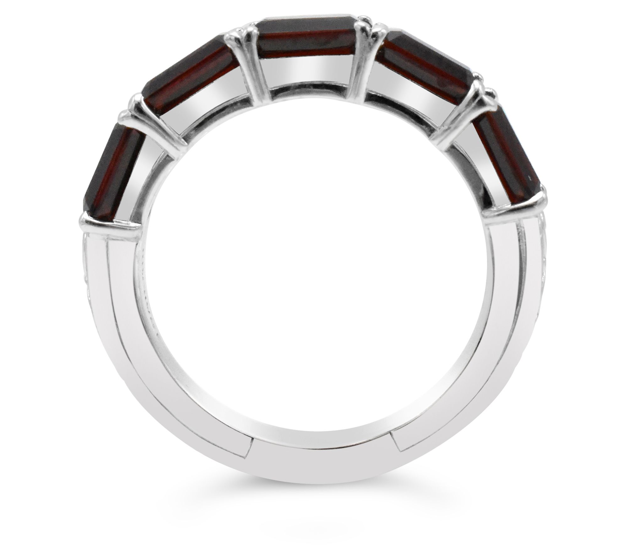Add a touch of elegance to your jewelry collection with this semi-eternity band ring. This stunning piece features five prong-set octagon cut red garnet gemstones, complemented by a heart scroll texture down the sides. Perfect for any occasion, this ring is sure to become a cherished favorite. From Elyse Ryan.