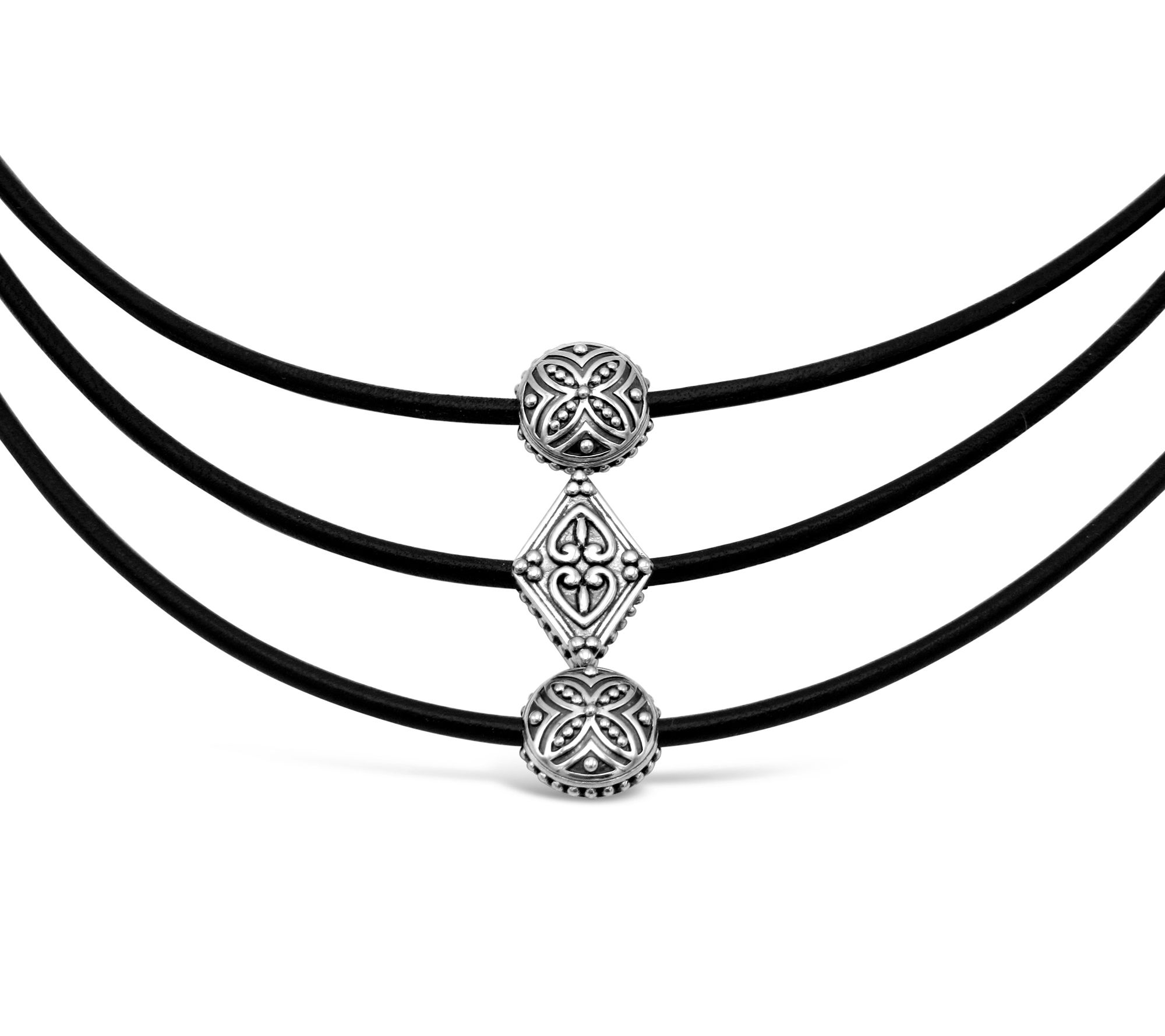 • Three black leather cords with bar station with two round beads and one diamond-shaped bead; scroll and bead motifs