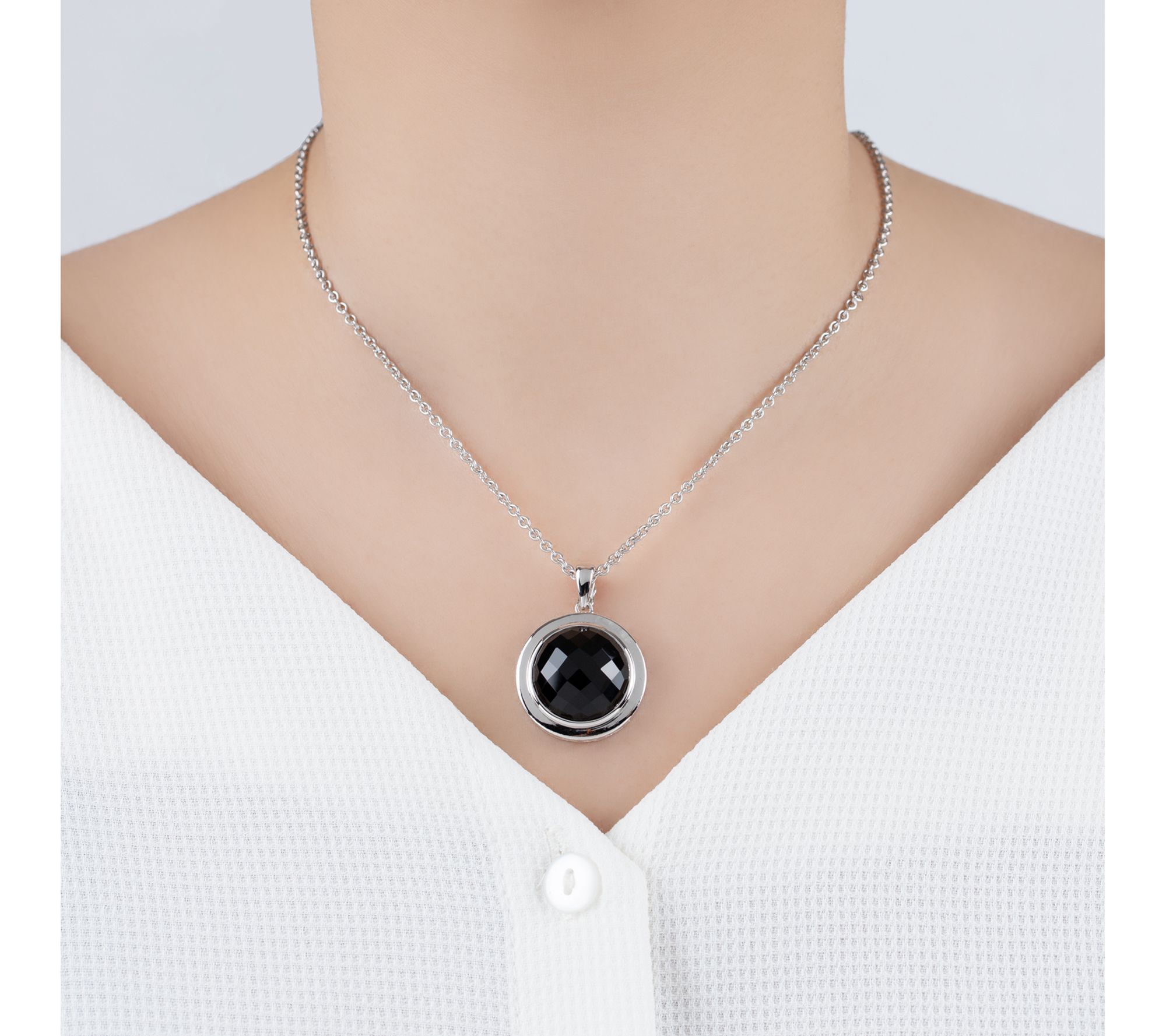A glimmer of polished onyx adds modern intrigue to days at the office or weekend outings with jeans and boots. The round pendant's sleek, faceted style pairs easily with favorites from your closet. Layer it over a sweater or let it stand alone -- versatility comes standard. From Elyse Ryan.