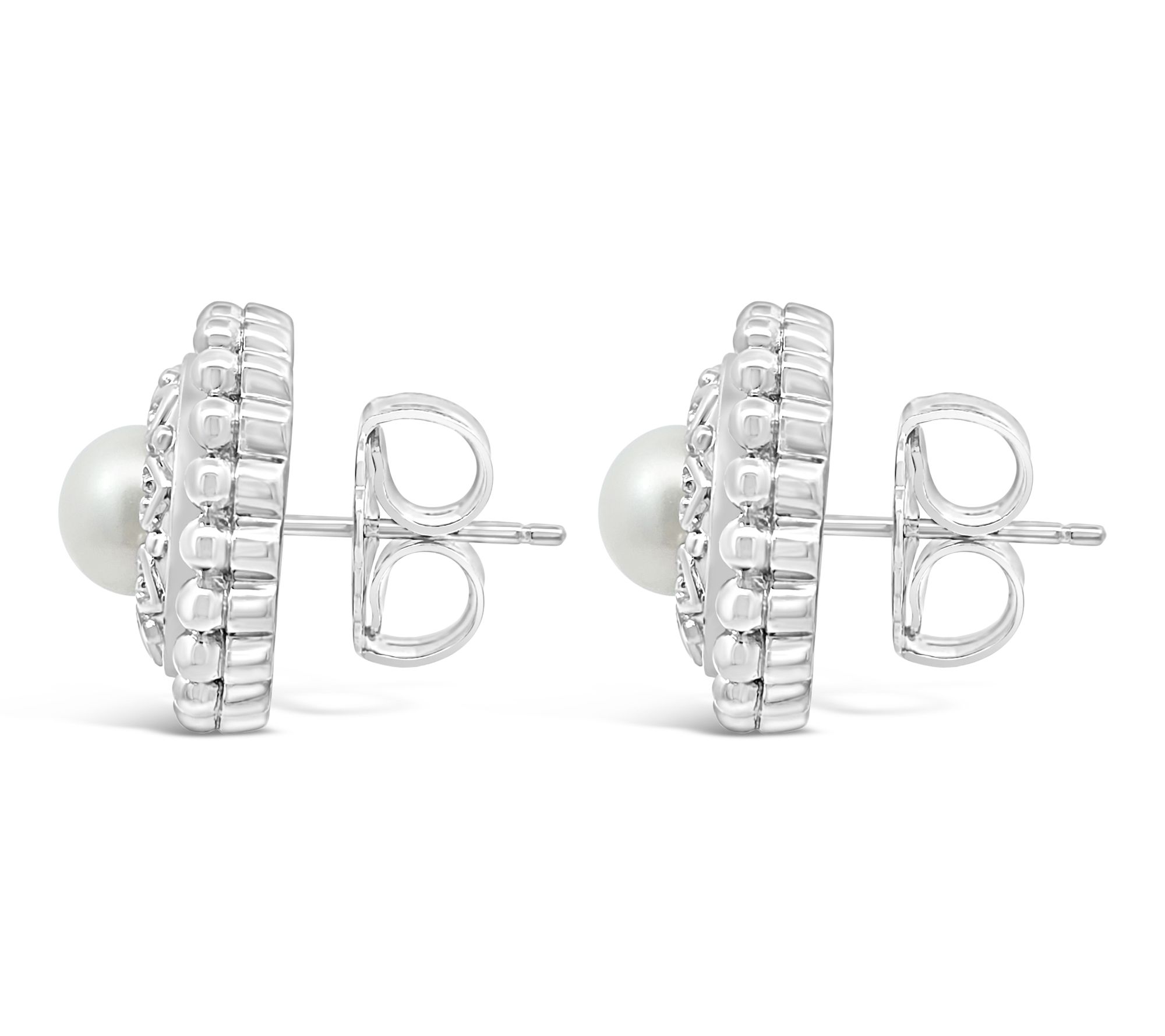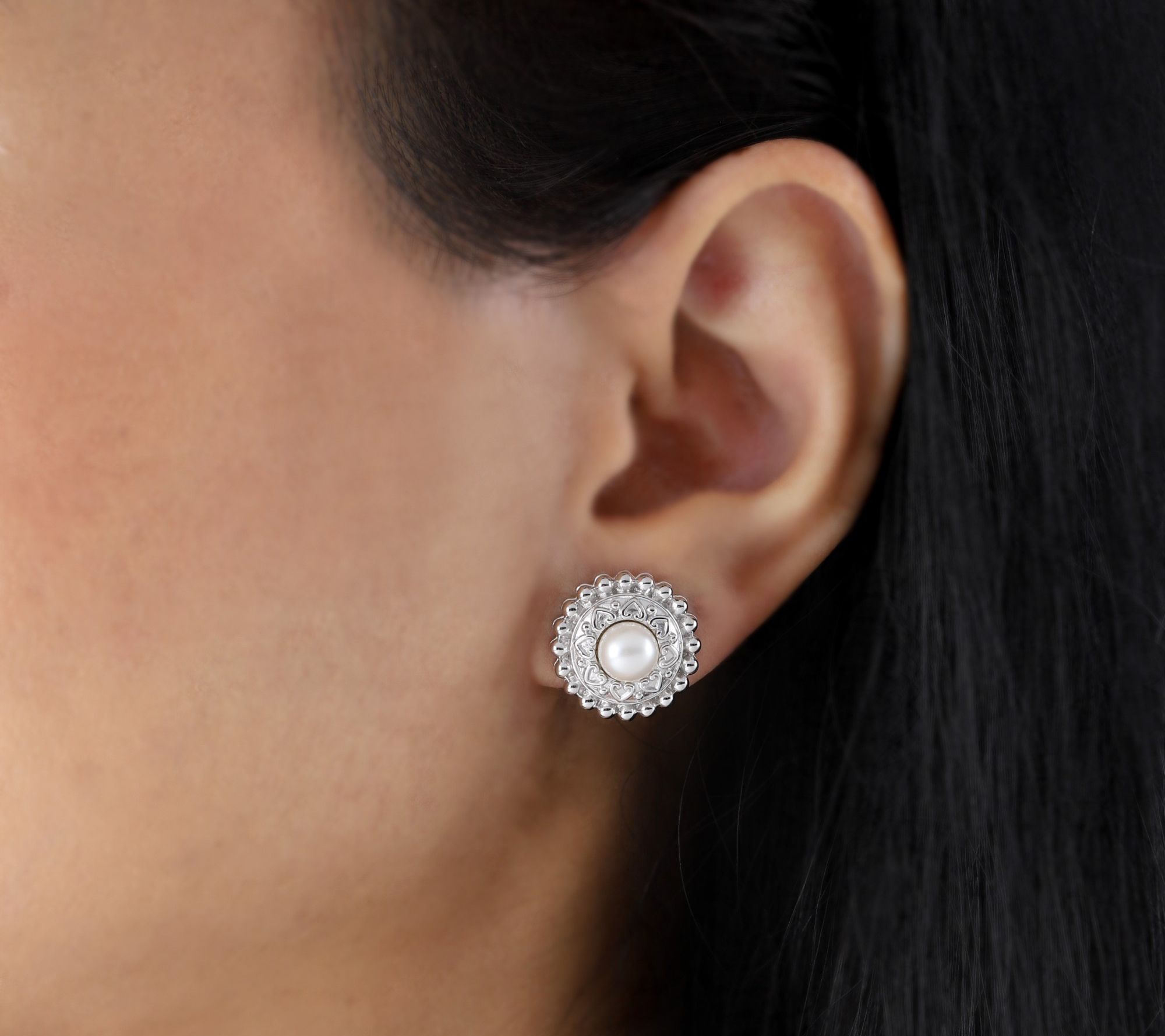 Slipping on these button earrings brings a charming touch to your everyday style, with luminous cultured freshwater pearls centered on sterling silver and surrounded by delicate hearts and a beaded edge. Designed to catch the eye whether you're at brunch with friends or adding a sweet accent to your work look. From Elyse Ryan.