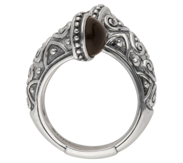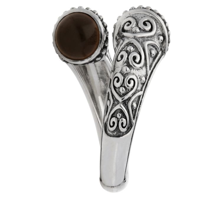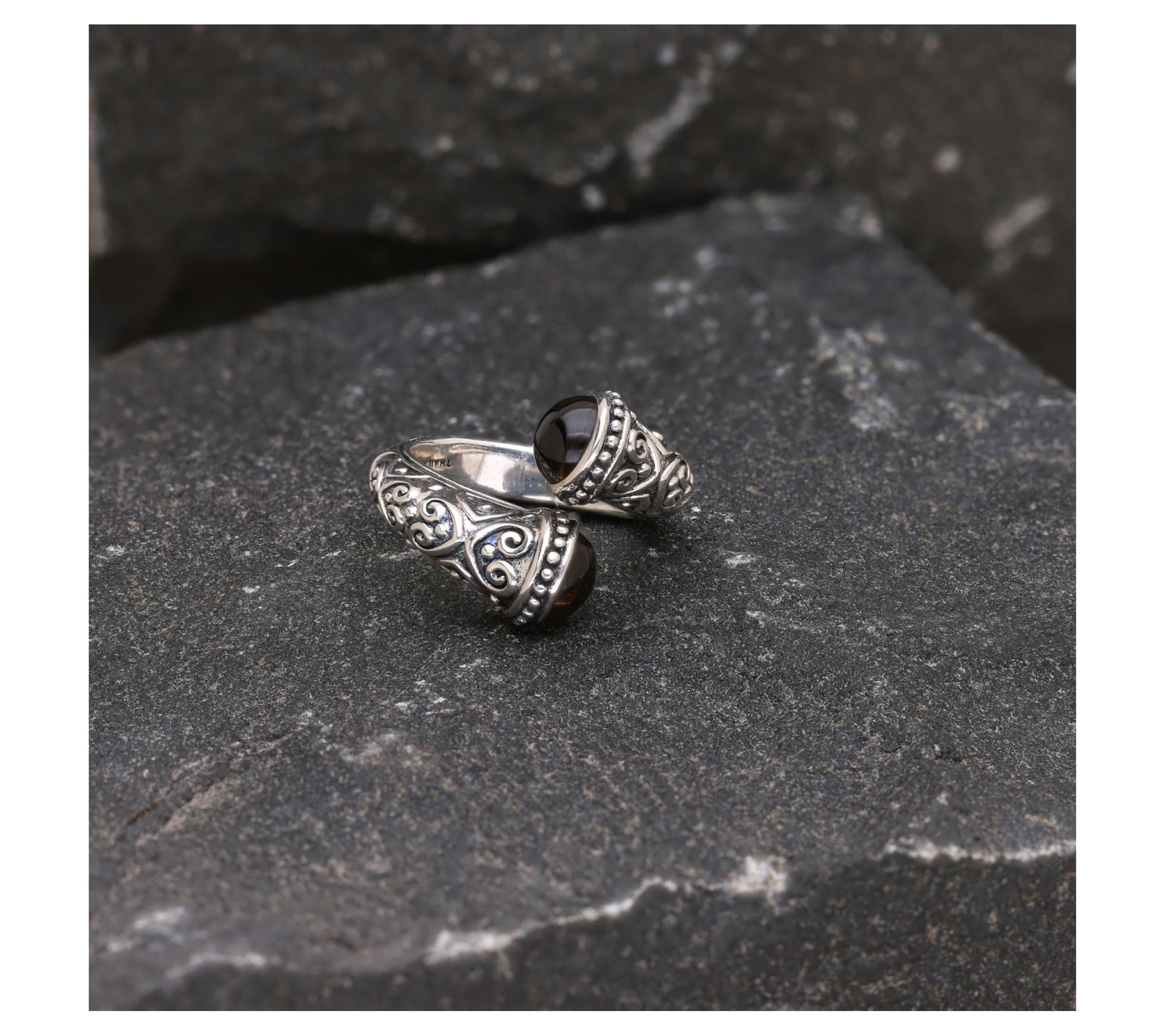 Discover the enchanting allure of this bypass ring featuring two beautifully bezel-set smoky quartz cabochons that captivate with their deep, rich hue. The ring's design is further enhanced by delicate beading around the bezels and a signature scroll pattern, making it a unique piece that adds a touch of elegance to any outfit. From Elyse Ryan.