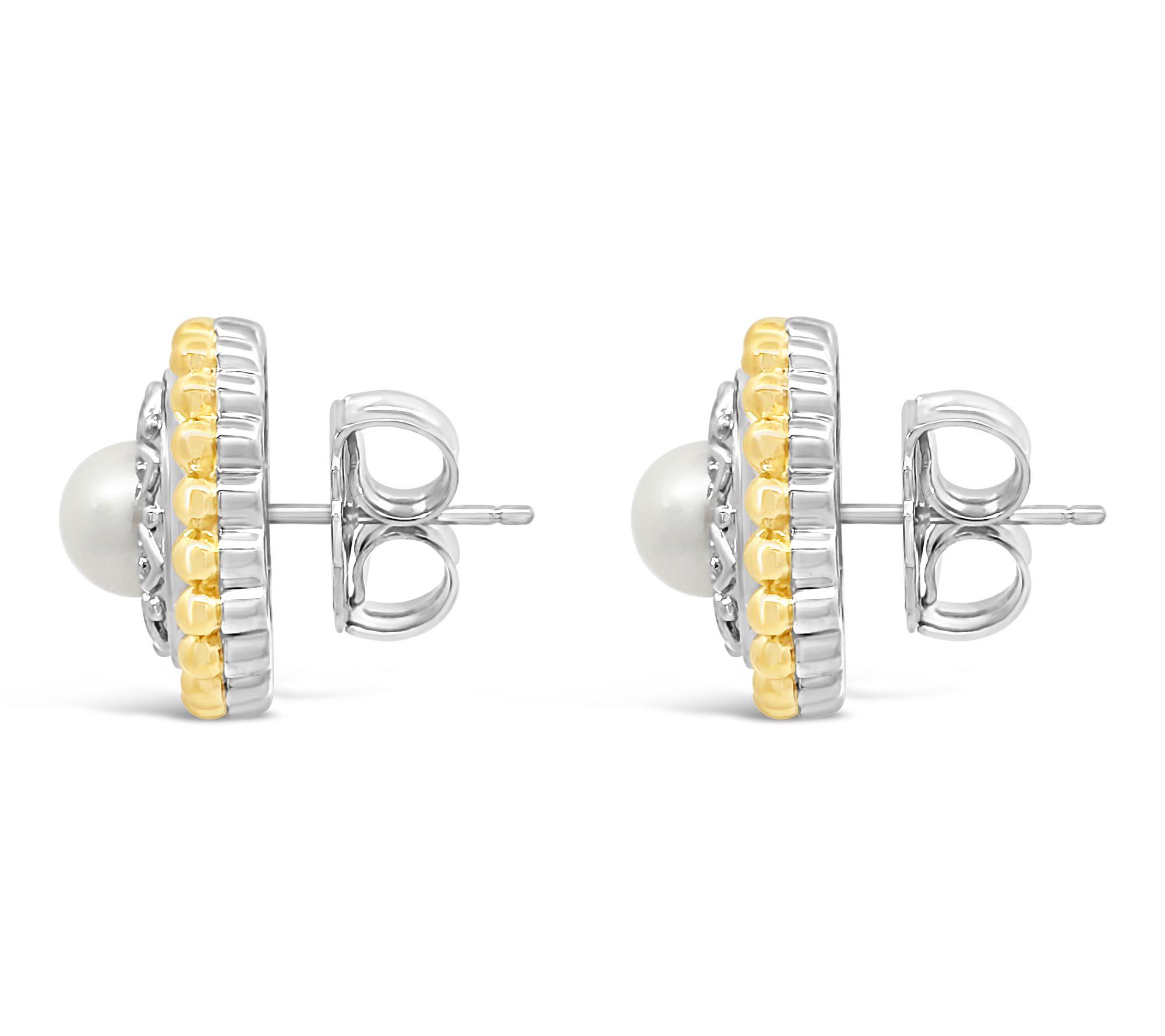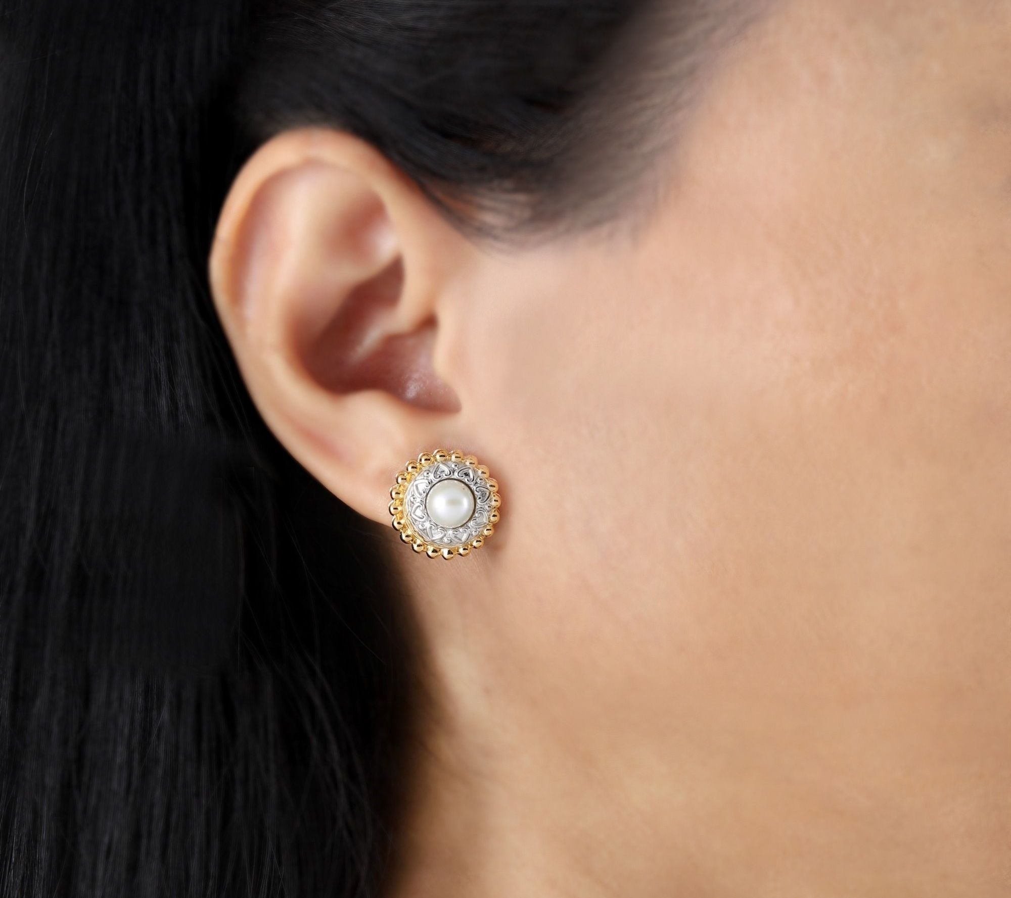 Classic yet full of romance, these cultured pearl button earrings feature white pearls framed by sterling silver hearts and a fine beaded border in 14K yellow gold-clad sterling silver. Perfect for day or evening, the two-tone finish adds subtle radiance whether you're at brunch or dancing the night away. From Elyse Ryan.