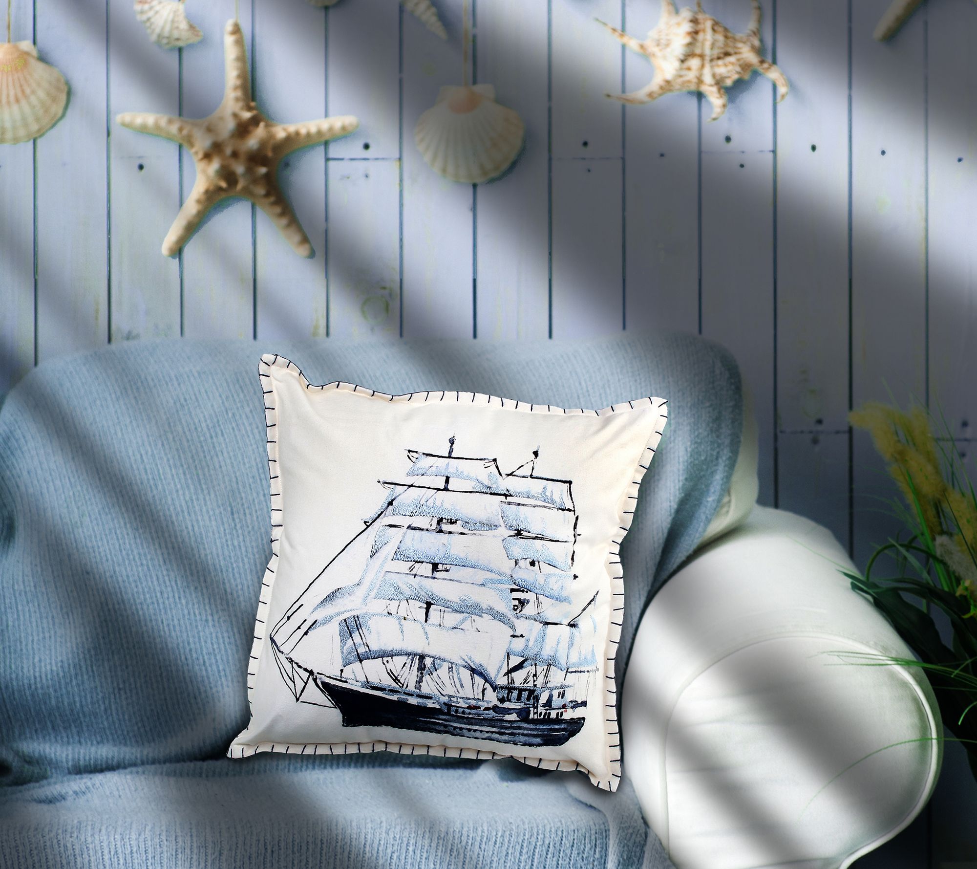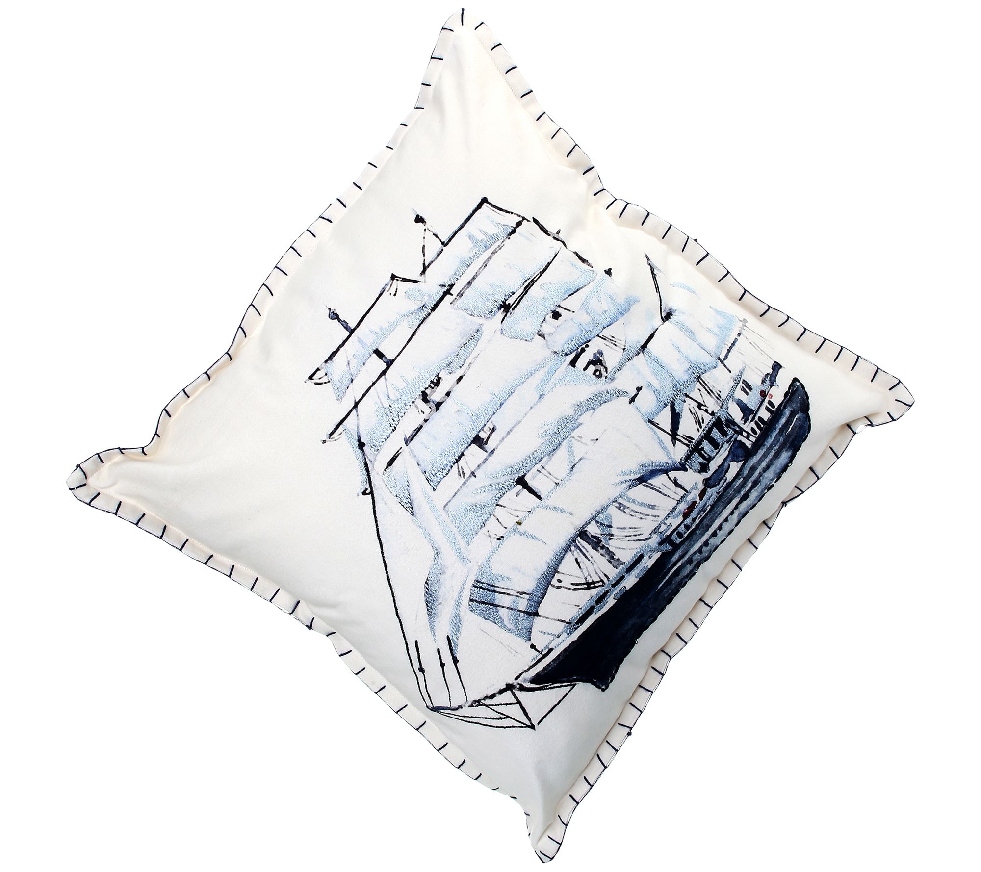 Embroidered Schooner Pillow 18" x 18" by Valerie