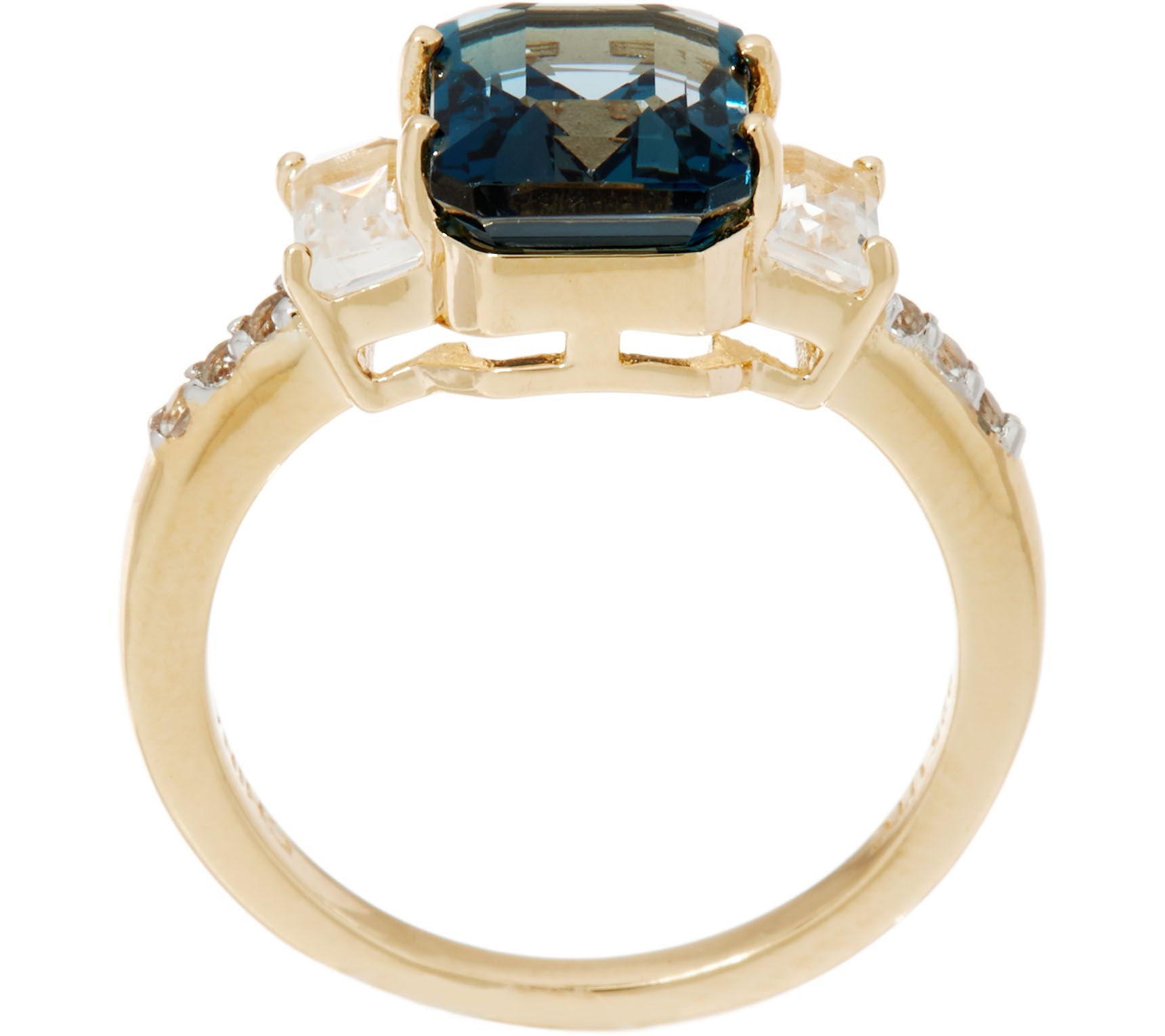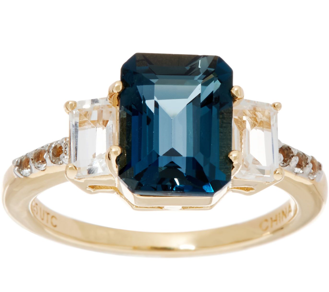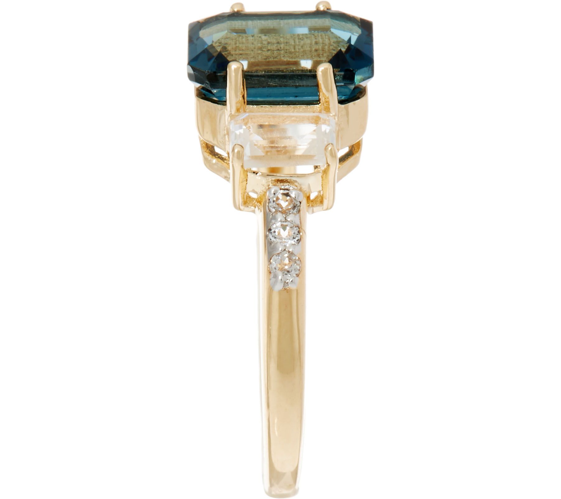 Emerald-cut, prong-set London blue topaz with emerald-cut, prong-set, round white topaz on either side; polished shank