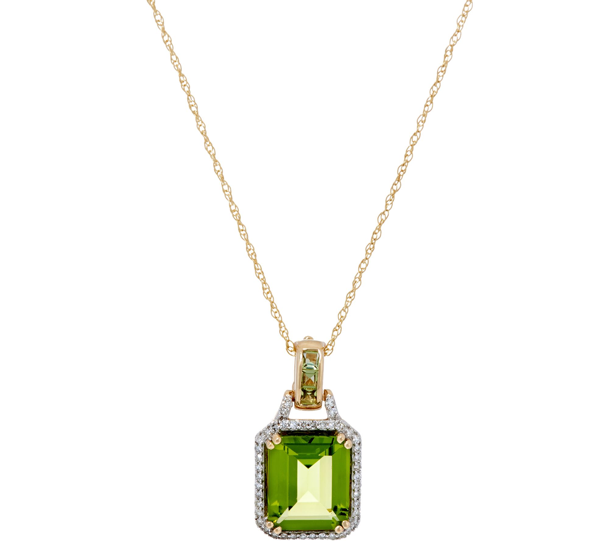 An emerald-cut peridot creates that gorgeous green glow you've been looking for, stunningly set off by a halo of white diamonds.