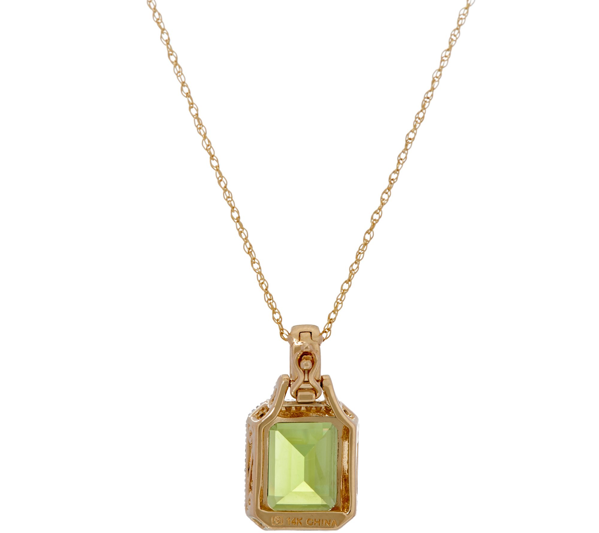 - Emerald-cut, prong-set peridot surrounded by halo of bead-set, round, white diamonds in rhodium plating