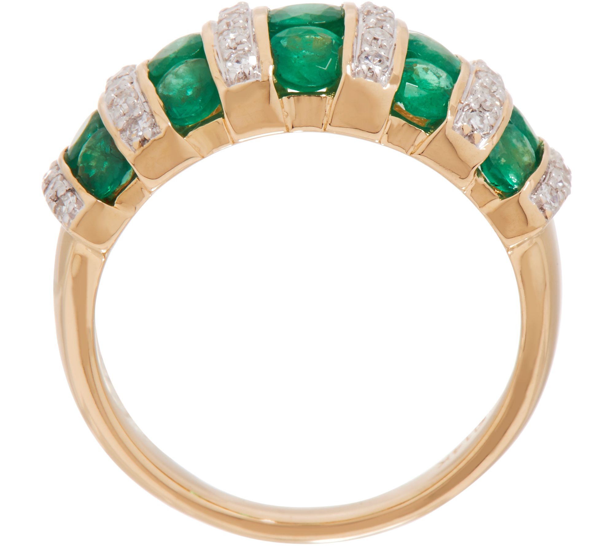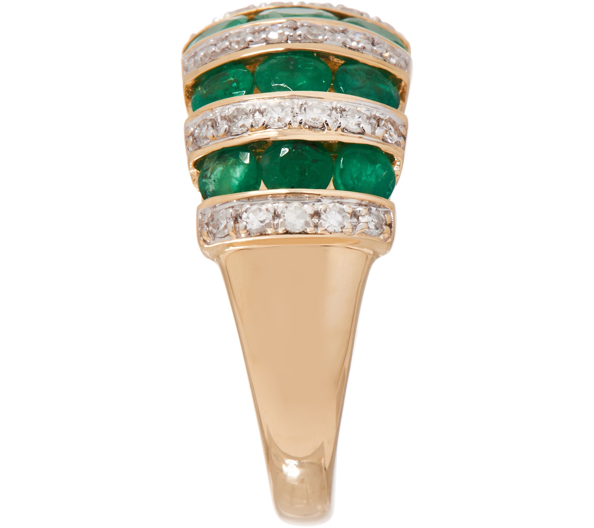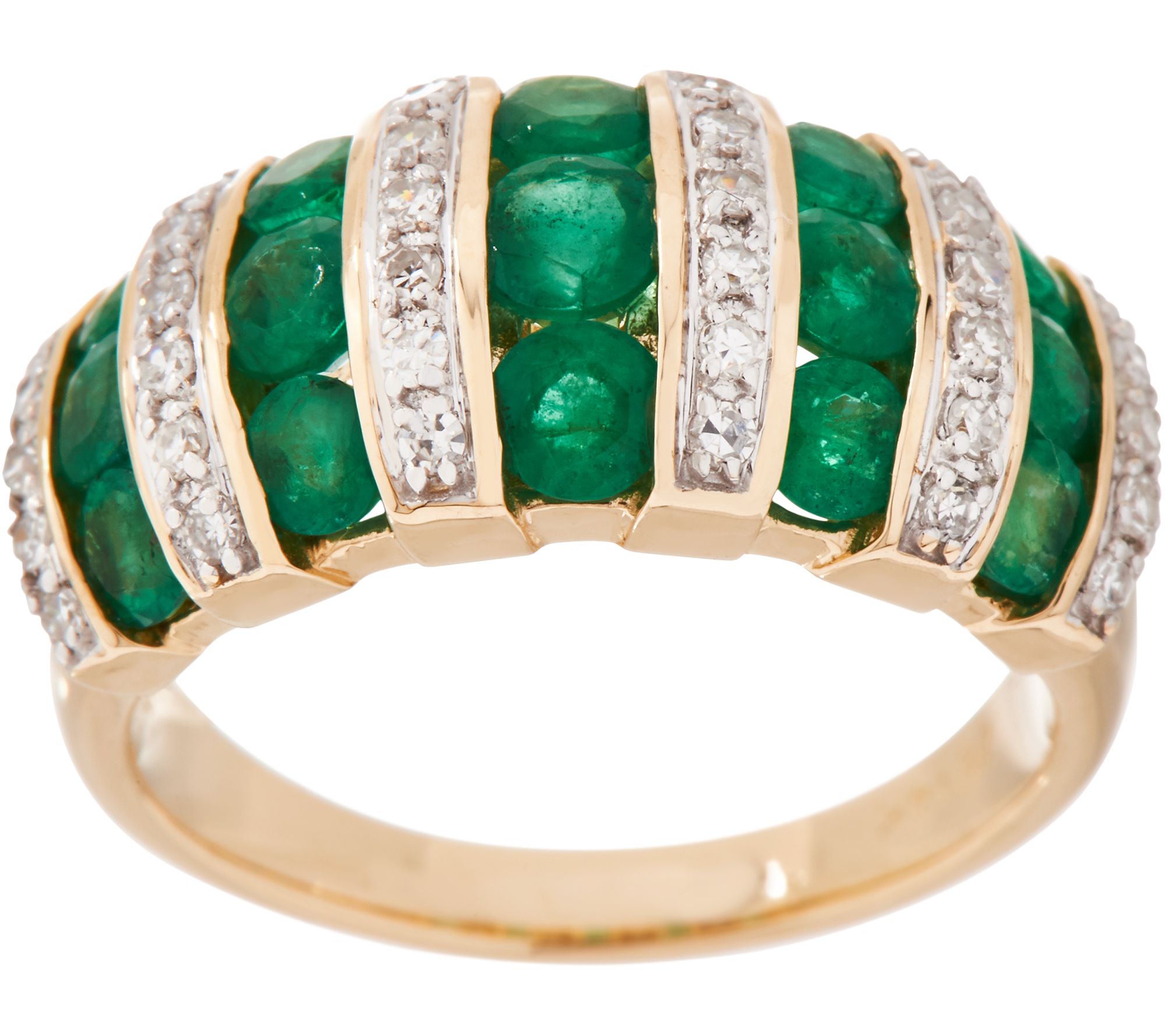 Five rows of flashing channel-set emeralds alternate with rows of round white diamonds to create this stately ring.
