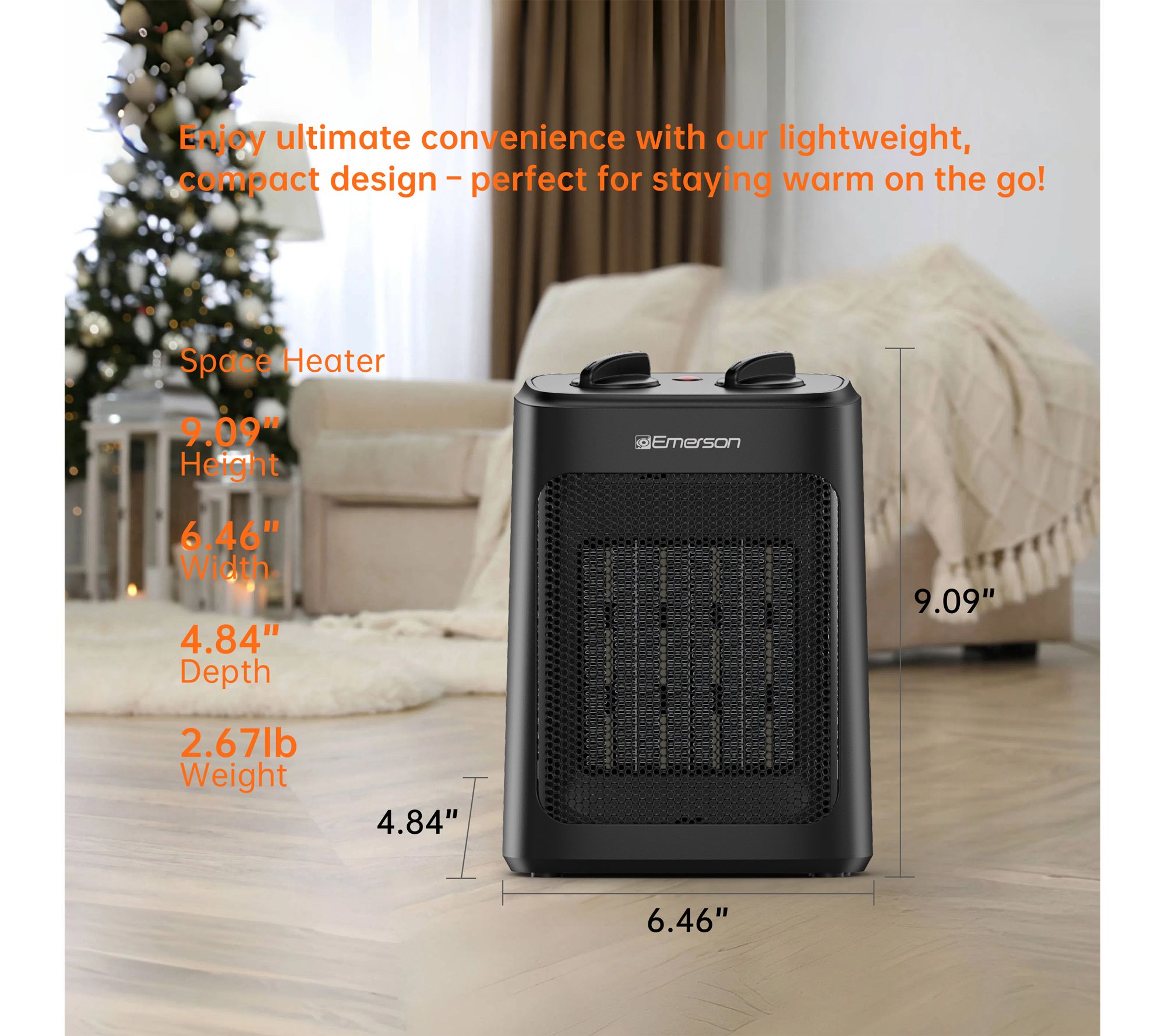 Chilly mornings feel much cozier with this electric space heater, offering three heating levels and a fan-only mode to keep your space comfortable all year. Enjoy quick heat, precise temperature control, and peace of mind from automatic shut-off and a tip-over safety feature. Move it easily from room to room with the convenient carry handle. From Emerson.