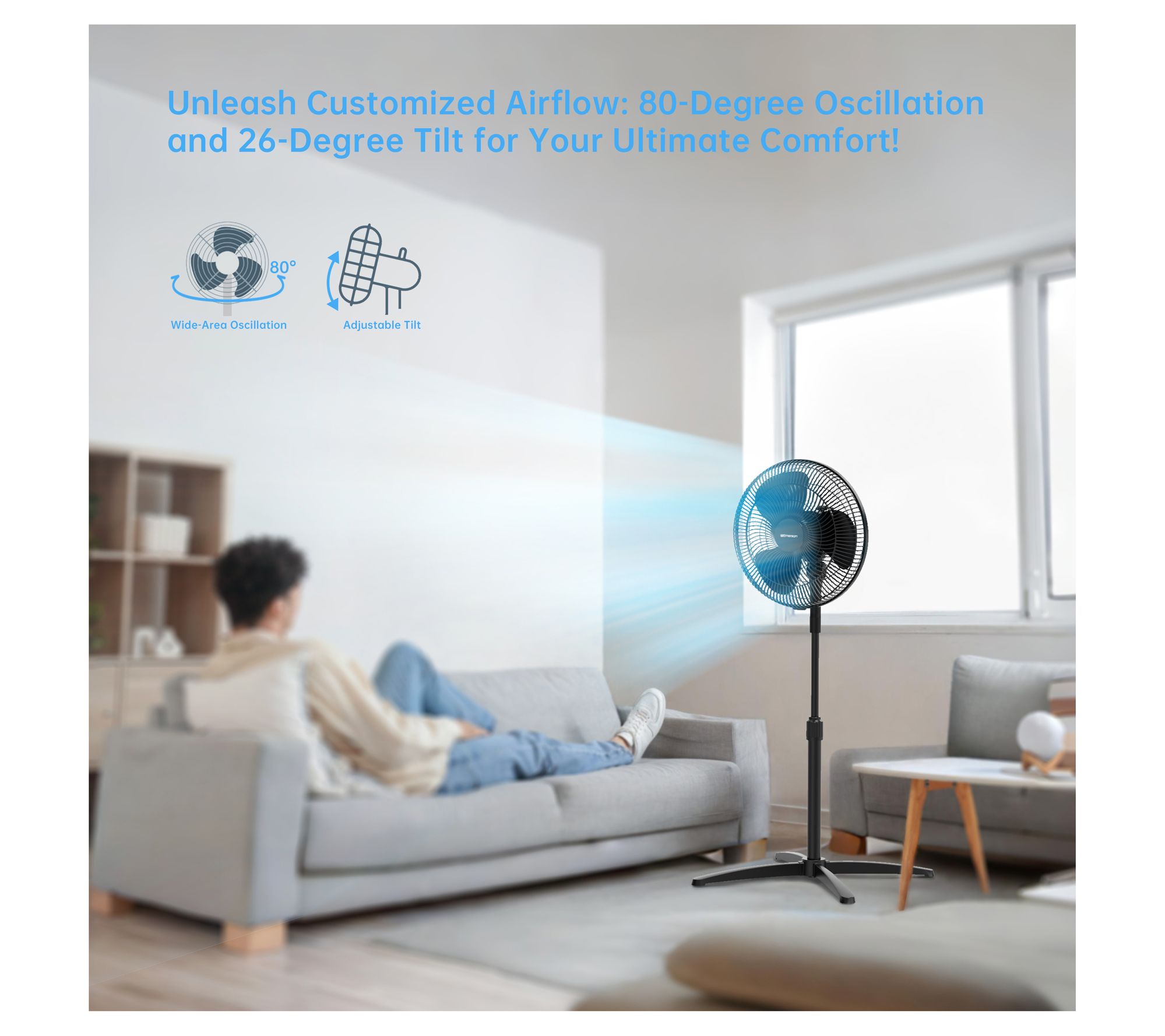 • Adjustable vertical tilt and 805-degree manual oscillation