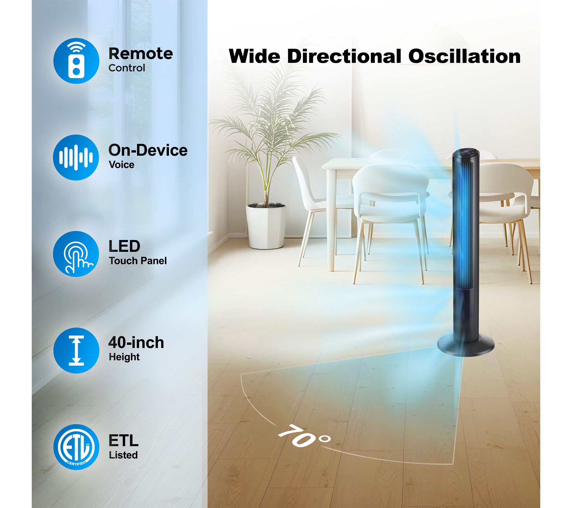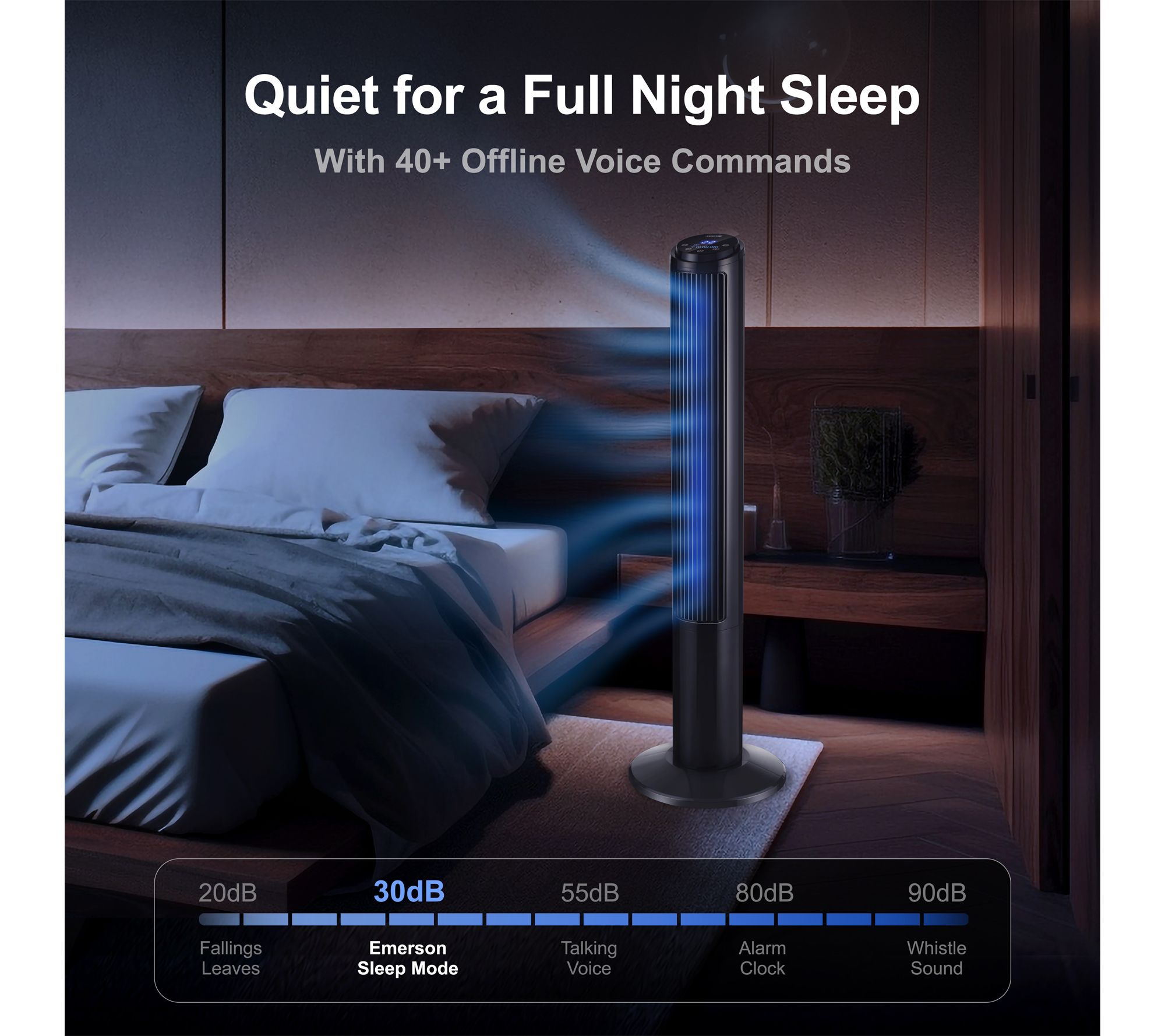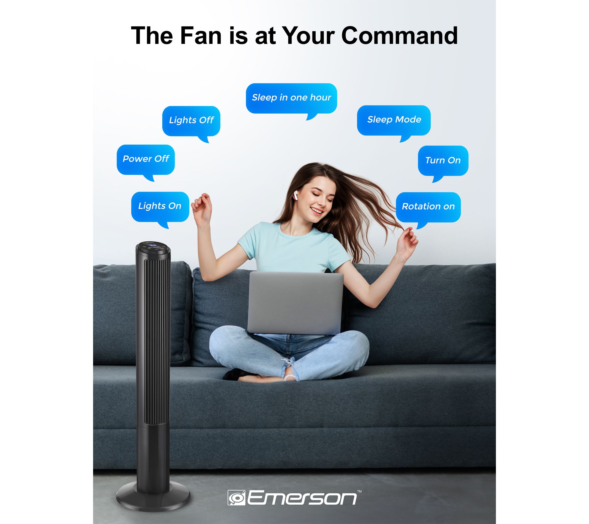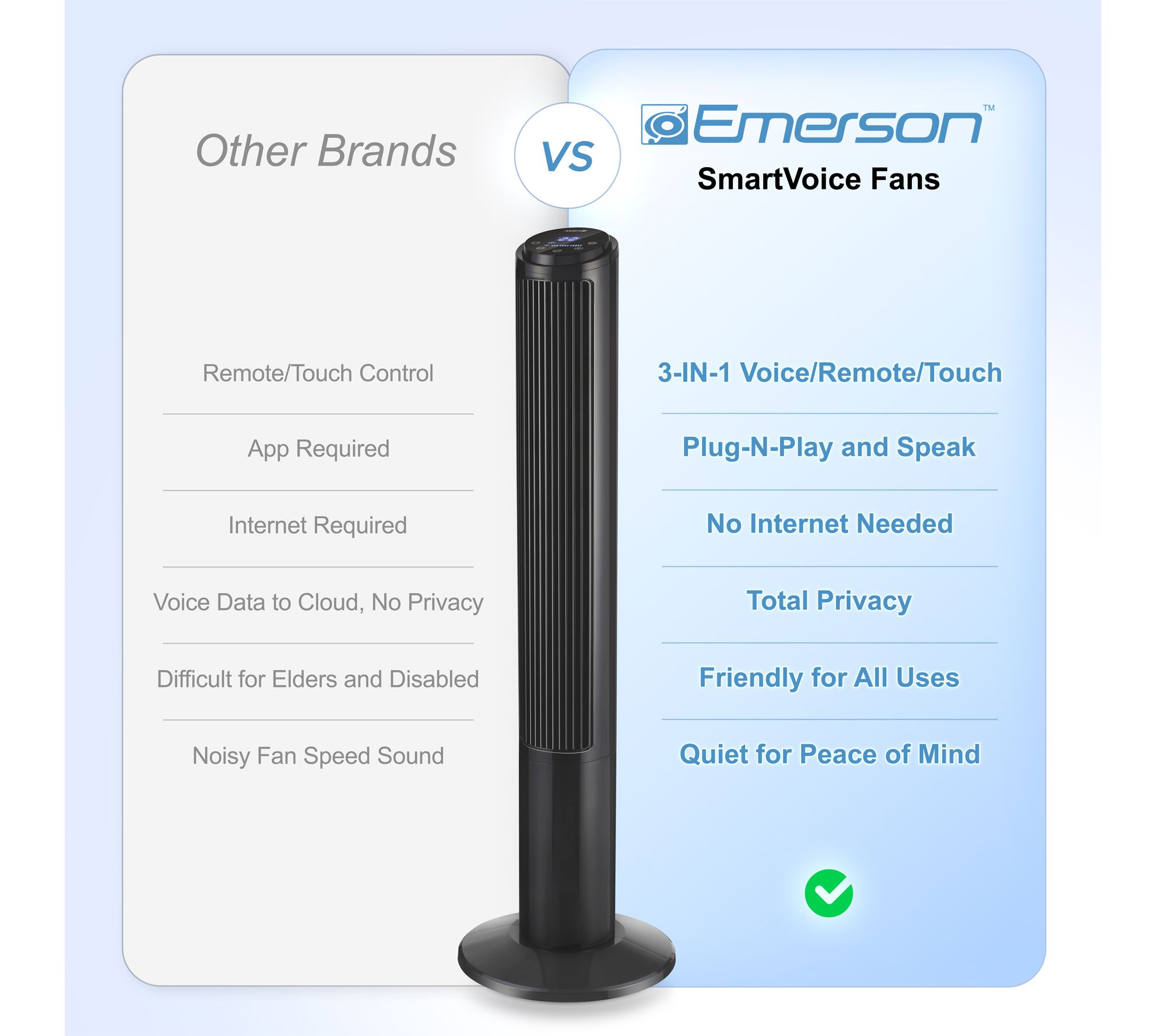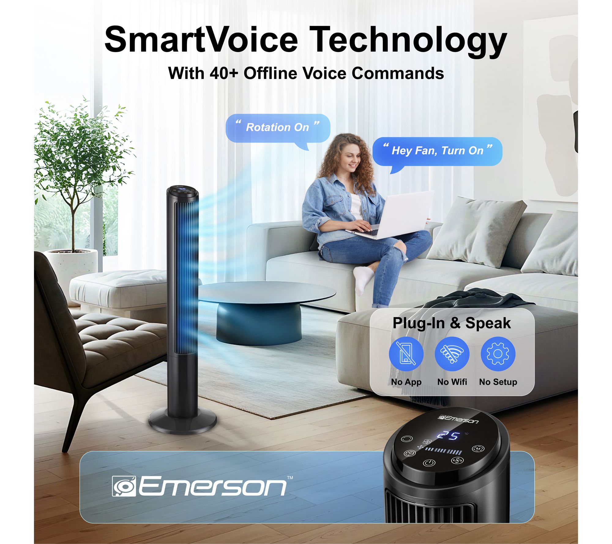 Cool down your space with the Emerson SmartVoice Tower Fan, designed for voice-activated comfort without the need for Wi-Fi, apps, or setup. Effortlessly manage three fan speeds, oscillation, and timer settings by voice, remote, or touch -- perfect for relaxing evenings, busy mornings, or for those who appreciate convenience. From Emerson.