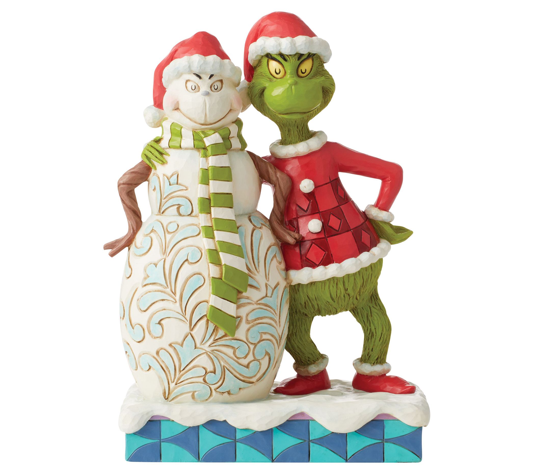 Capture the whimsical spirit of the season with this grumpy yet beloved character. The Grinch stands proudly next to a sassy snowman creation, modeled in his own image, both sporting matching grimaces with hands on hips. It's a delightful piece that features Jim Shore's signature rosemaling and intricate patterns, adding a festive touch to your holiday decor. From Enesco.