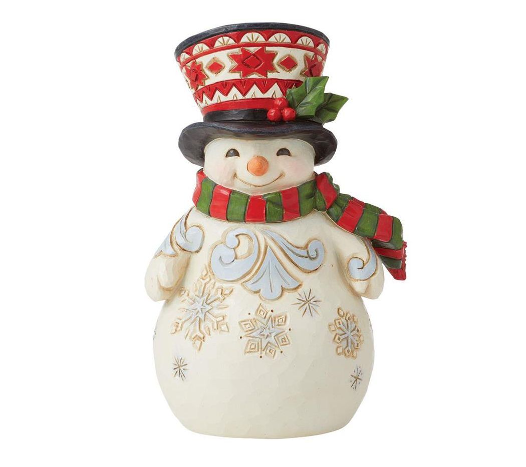 Bring festive spirit to any decor with this detailed snowman figurine featuring a cheerful face and an ornate hat. From Jim Shore.
