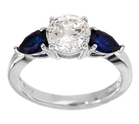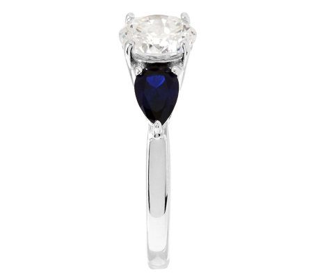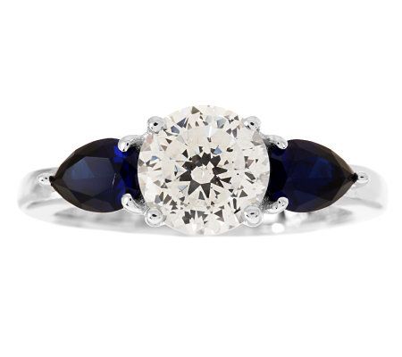 • Center prong-set, round, 100-facet Diamonique simulated diamond with prong-set, pear-shaped simulated gemstone on each side; highly polished; openwork gallery
