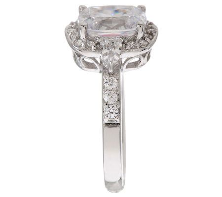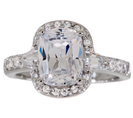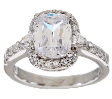 Behold its brilliance. This radiant ring glimmers with a center emerald cushion-cut, prong-set Diamonique(R) simulated diamond surrounded by round, prong-set Diamonique simulated diamond accents and a fancy, bullet-shaped Diamonique simulated diamond on each side. From Epiphany(R) Platinum Clad(R) Sterling Silver and Diamonique Jewelry.