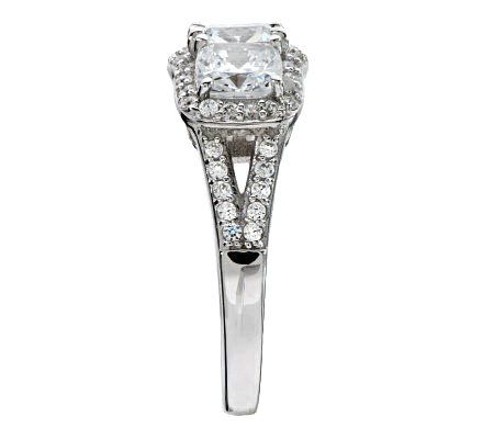 Brilliant beauty. A timeless addition to your jewelry collection, this ring bursts with shimmer, thanks to three clear, prong-set Diamonique(R) simulated diamonds. A collection of smaller, clear, round Diamonique simulated diamonds glistens around the trio, while a split-shank design finishes the piece. From Epiphany(R) Platinum Clad(R) Sterling Silver and Diamonique Jewelry.