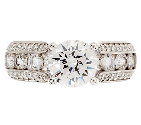 Simply put, this ring is spectacular. A round Diamonique(R) simulated diamond is prong set above a bridge of channel-set Diamonique simulated diamonds, while two more rows of bead-set Diamonique simulated diamonds deliver even more sparkle. It's one ring you just can't get enough of. From Epiphany(R) Platinum Clad(R) Sterling Silver and Diamonique Jewelry.