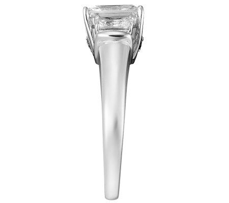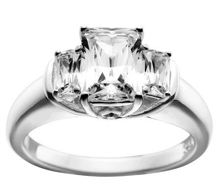 You'll relish every opportunity you get to show off this stunning ring. It boasts an emerald-cut, prong-set cubic zirconia Diamonique(R) simulated diamond at the center, flanked by a smaller, prong-set Diamonique simulated diamond on each side. Two round, bead-set Diamonique simulated accents adorn the openwork gallery for a brilliant finish. From Epiphany(R) Platinum Clad(R) Sterling Silver and Diamonique Jewelry.