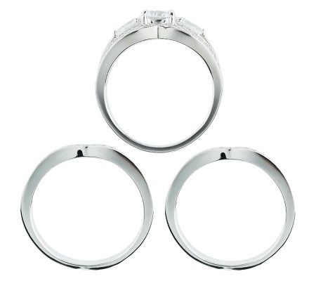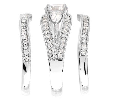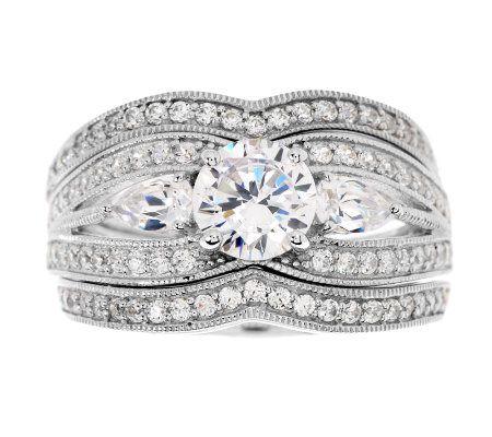 Now and forever. Celebrate your commitment to a special someone with this breathtaking, three-piece ring set. The show-stopper of the set flaunts a round, prong-set Diamonique(R) simulated diamond in the center, with a pear-shaped Diamonique simulated diamond on each side. It's complemented by two curved bands, each shimmering with round, bead-set Diamonique simulated diamonds. From Epiphany(R) Platinum Clad(R) Sterling Silver and Diamonique Jewelry.