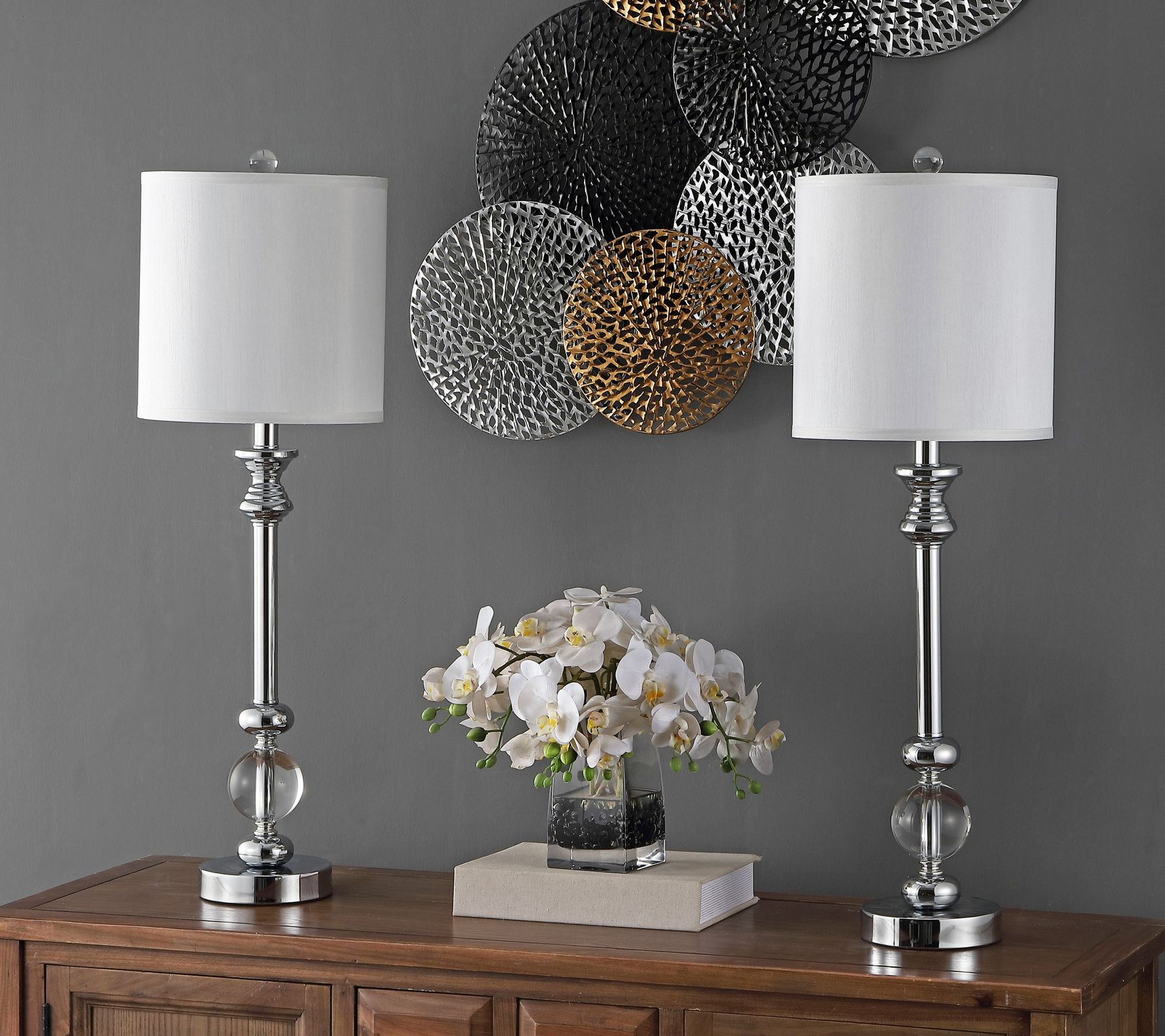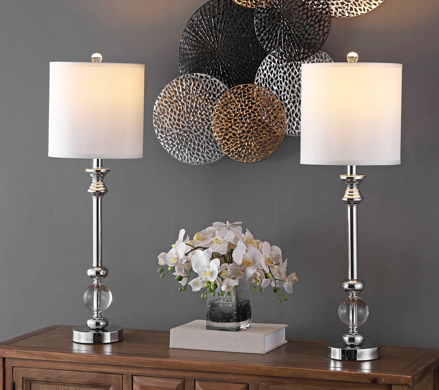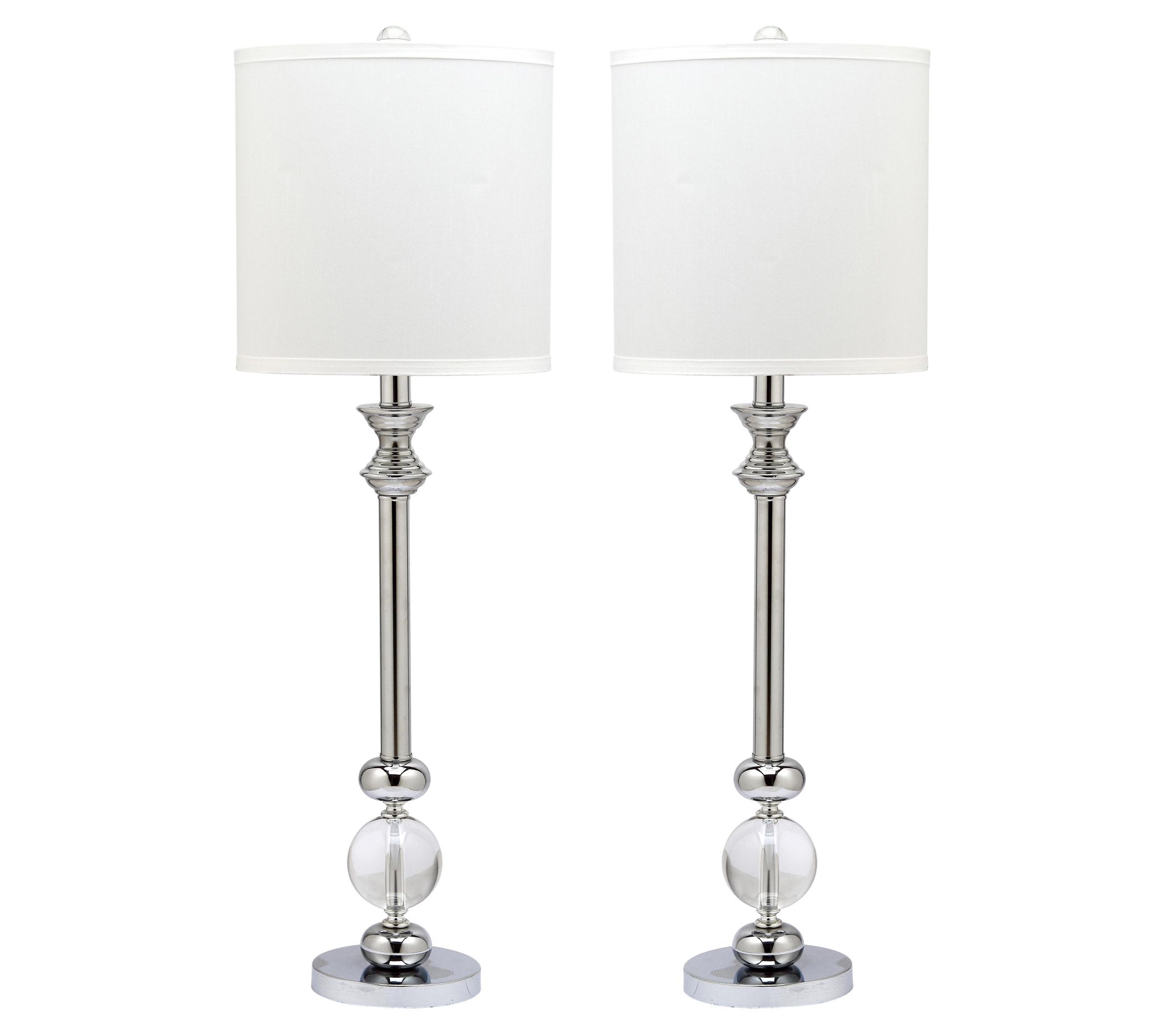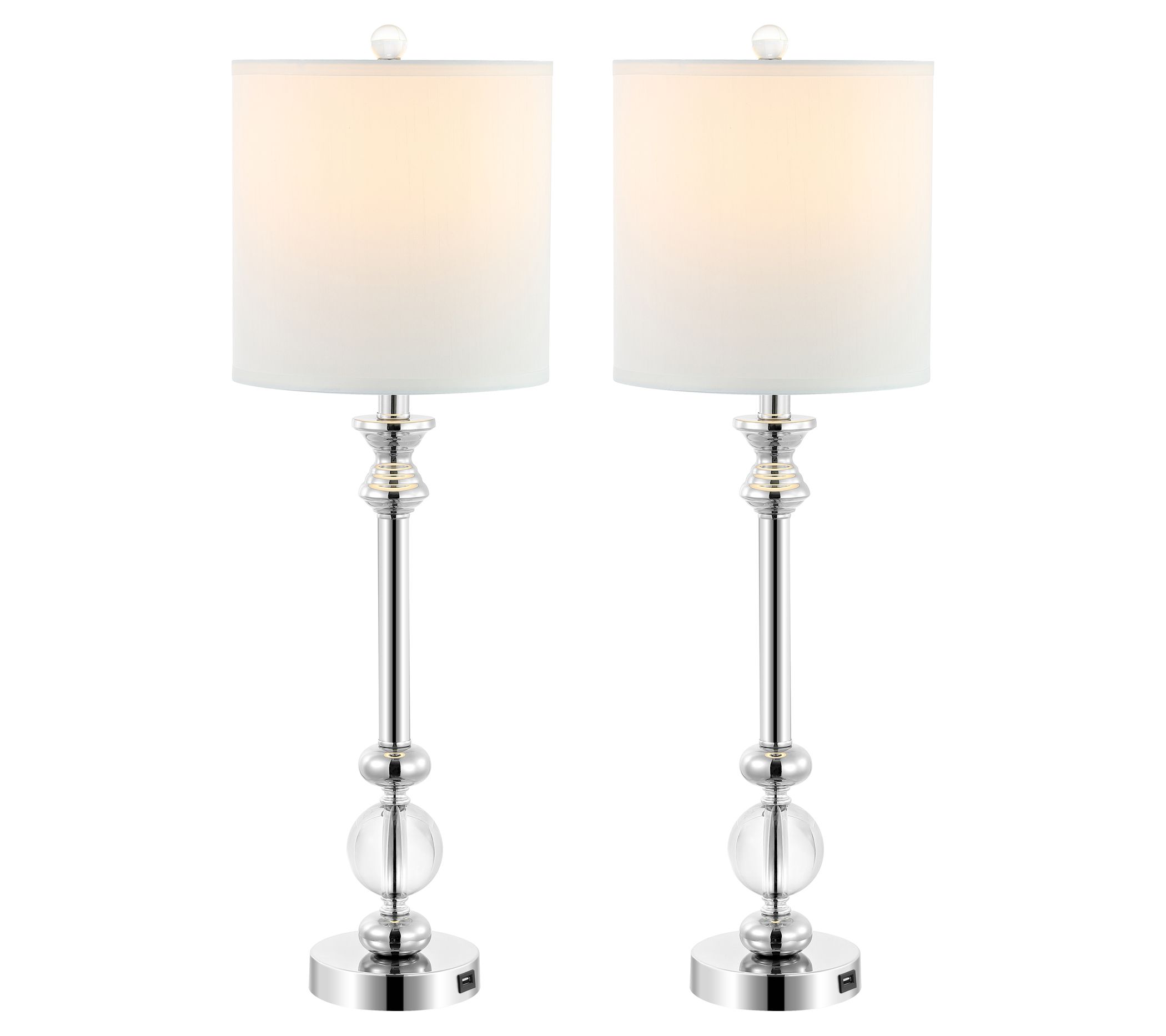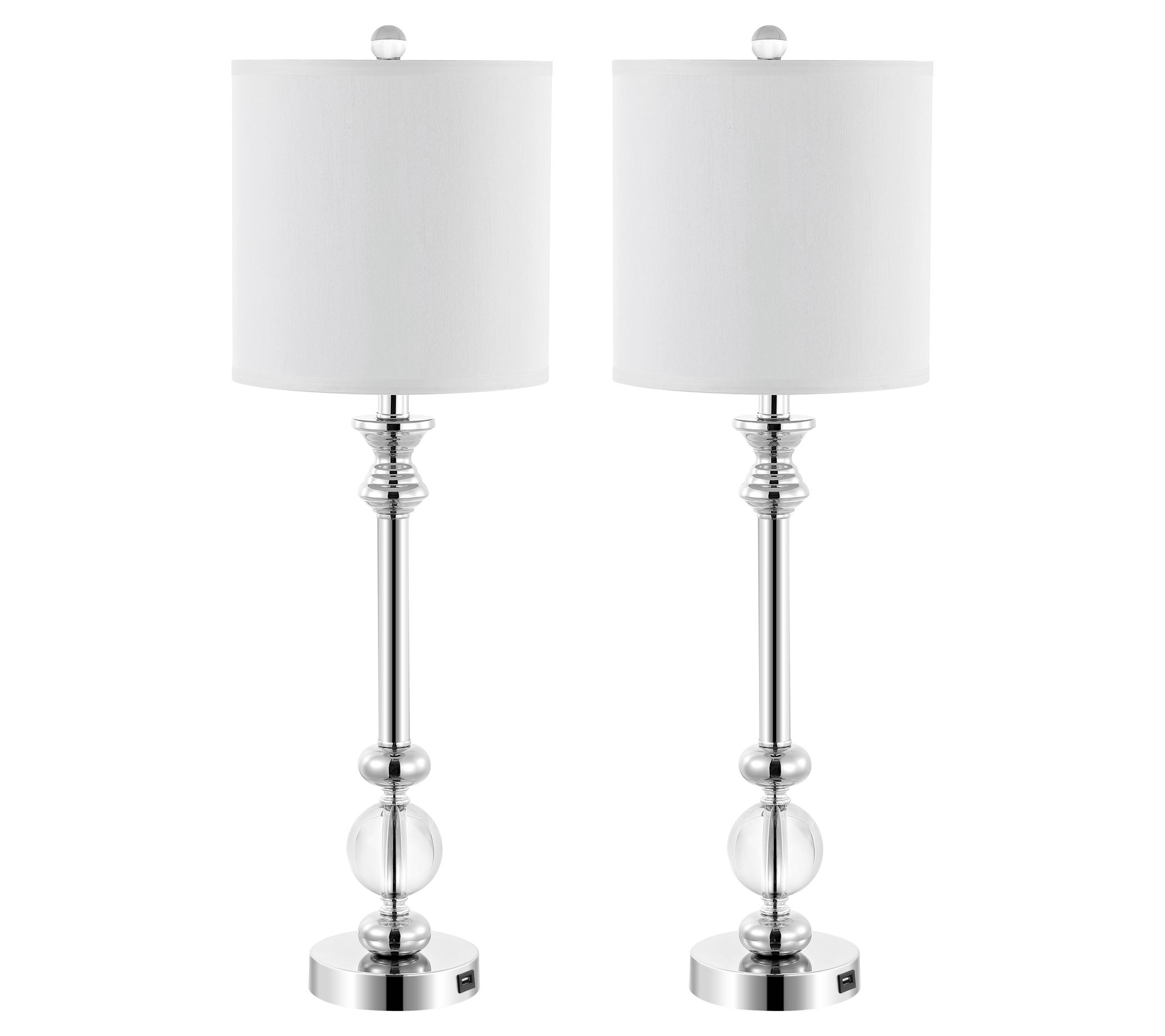 Classic form gets a modern makeover with these crystal candlestick lamps that not only lend chic shine to your living space, but keep your devices charged with built-in USB ports. From the Valerie Parr Hill Collection.