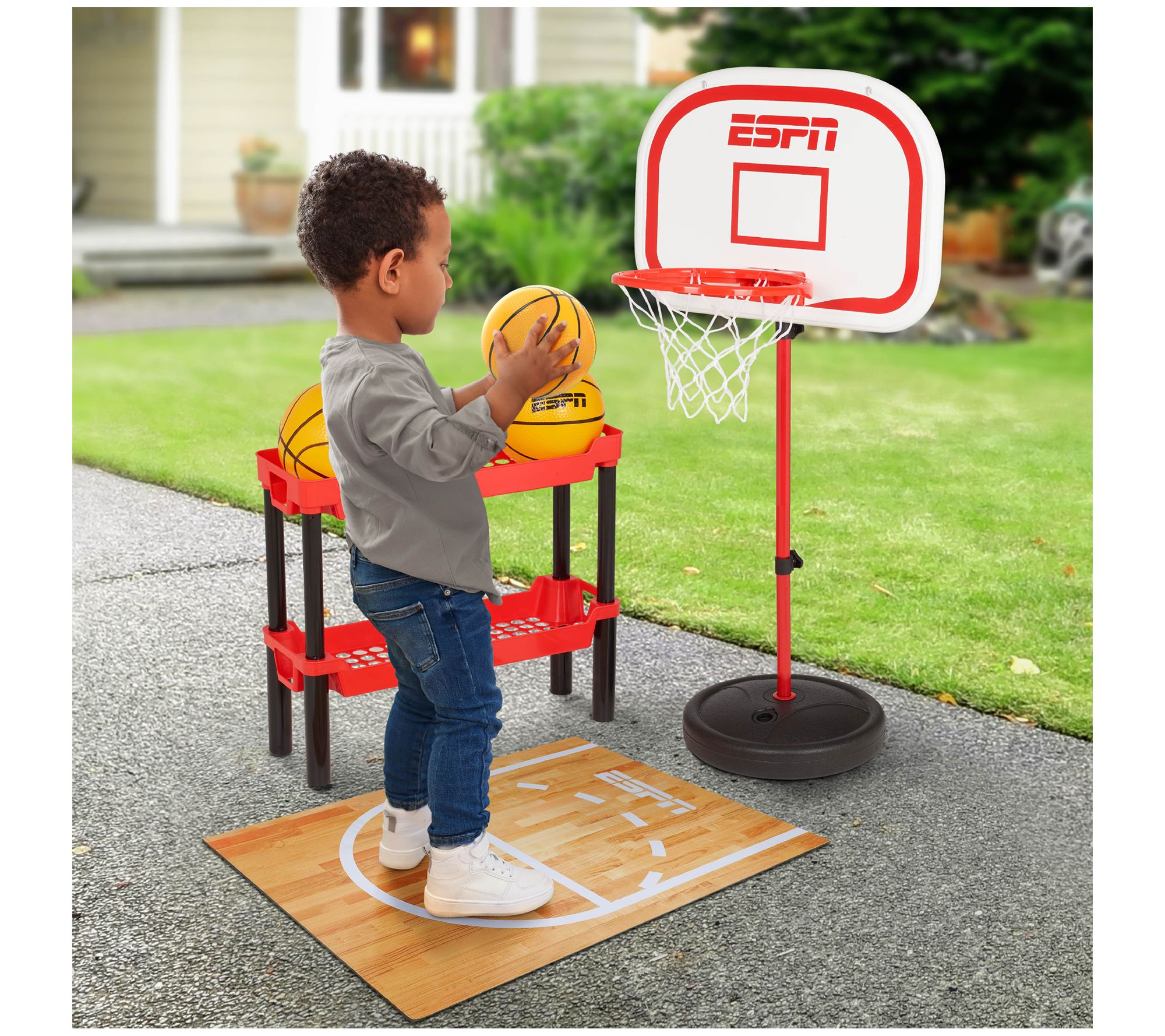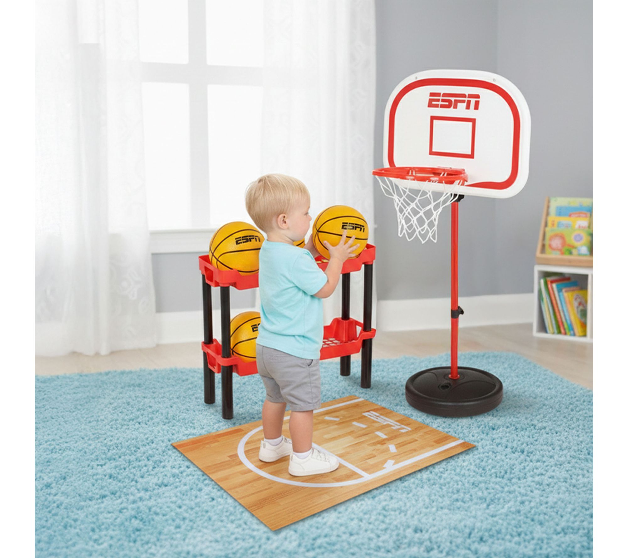 ESPN knows how to get kids into the game -- and off the couch (or away from screens)! This My First basketball set features a hoop with an adjustable stand, plus basketballs, a ball stand, and a colorful play mat. Each piece is designed for small hands and use in most any space, helping build skills while providing hours of active, engaging play. From ESPN.