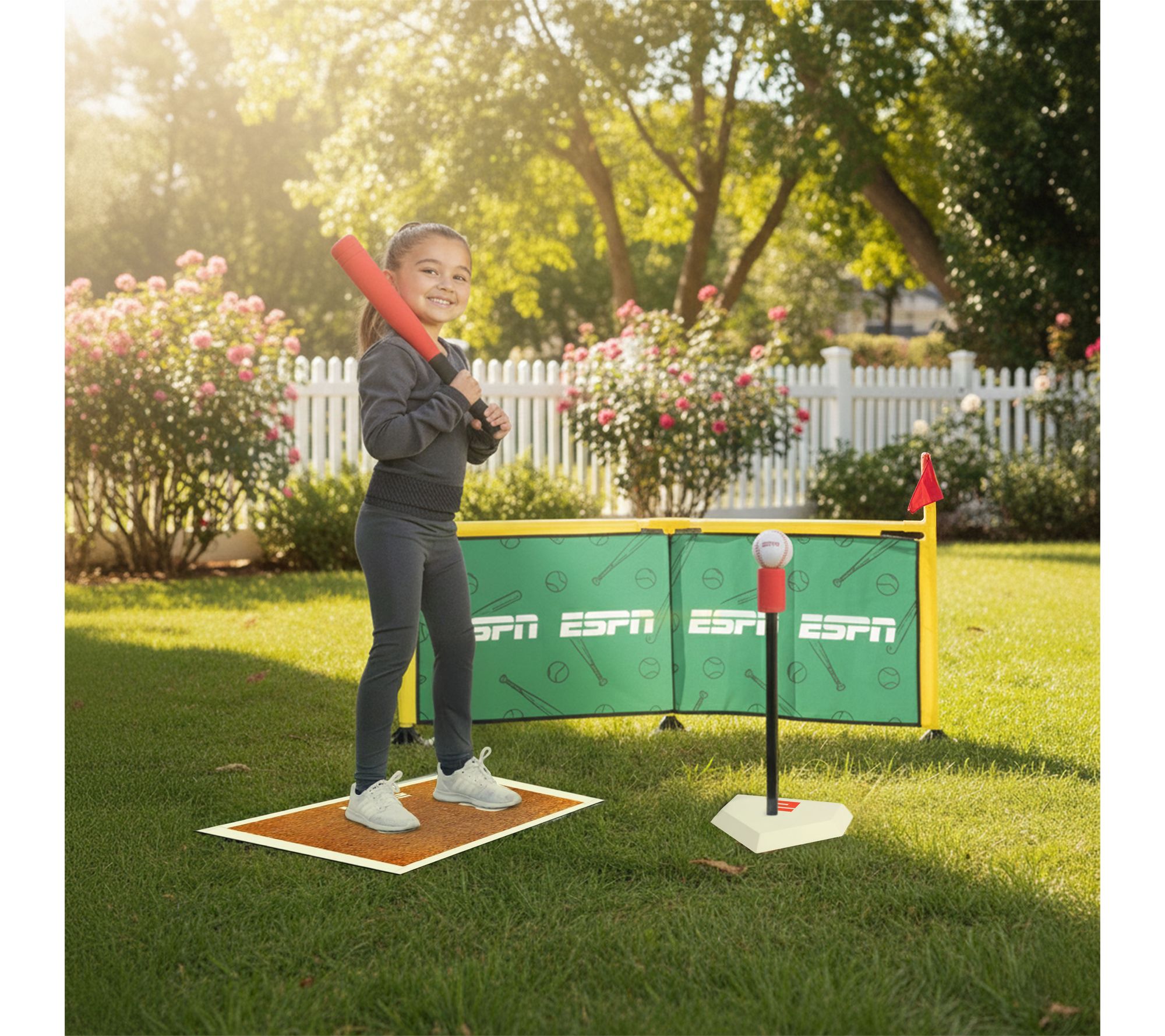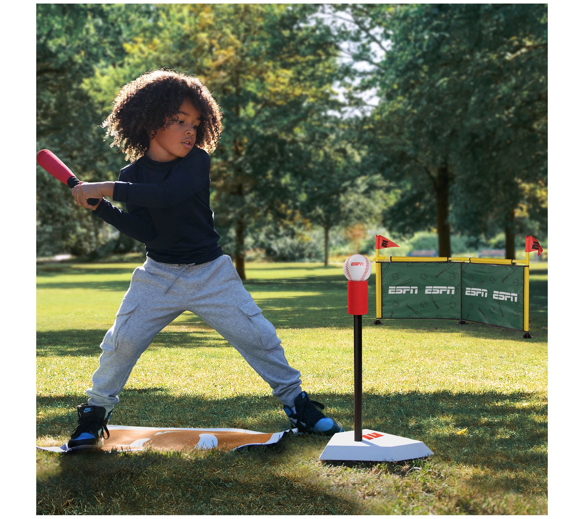 ESPN knows how to get kids into the game -- and off the couch (or away from screens)! This My First baseball set features a batting tee, foam baseball bat and ball, and outfield wall, plus a colorful play mat. Each piece is designed for small hands and use in most any space, helping build skills while providing hours of active, engaging play. From ESPN.