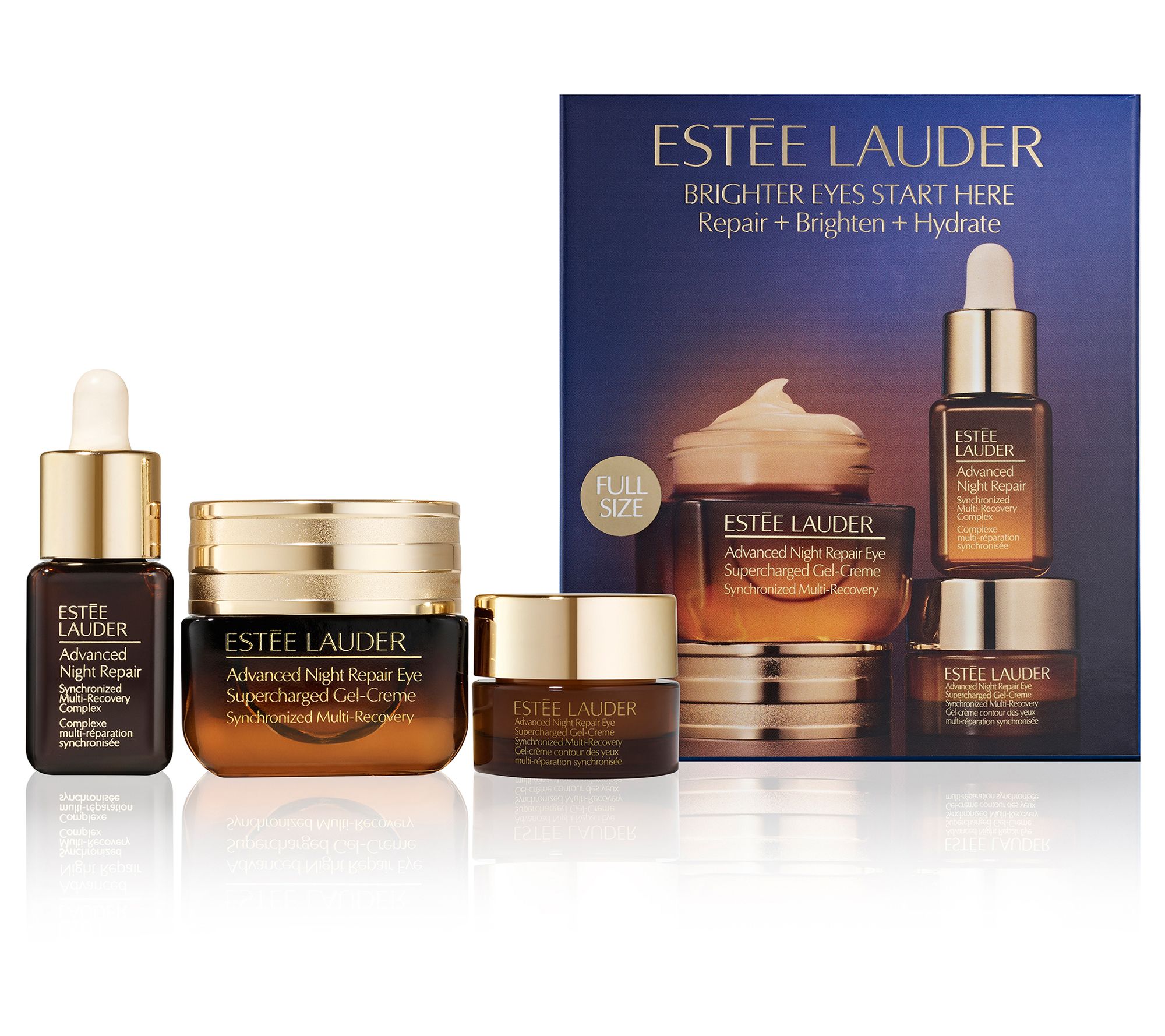 Brighter eyes start here. Discover high-performance formulas from Estee Lauder to reignite your radiance with this skincare gift set. It includes a full-size Advanced Night Repair Eye Supercharged Gel-Creme that targets multiple eye area concerns: crows feet lines, lines between brows, under eye lines, wrinkles, puffy eyes, and dark circles. Eyes bounce back, looking more youthful, vibrant, and healthy. It reduces the look of puffy eyes and nourishes and hydrates. Advanced Night Repair Serum helps skin look smoother with less fine lines and wrinkles appear reduced, for younger, more radiant looking skin.