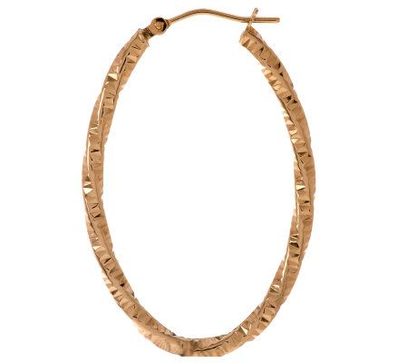 Putting on the twist. Spend your last two bits on these swanky earrings...you'll be glad you did. The 14K yellow gold oval hoops boast a diamond-cut ridged pattern. But what really makes them stand out is the way they're twisted from front to back. From the EternaGold(R) Collection.