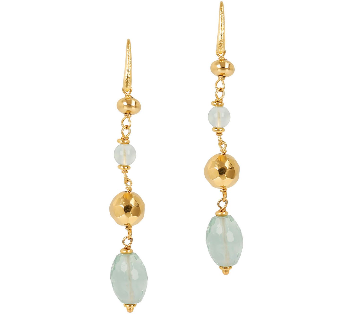 • Dangle design with polished flat bead, polished round green fluorite bead, faceted round bronze bead, and larger faceted oval-shaped green flourite bead