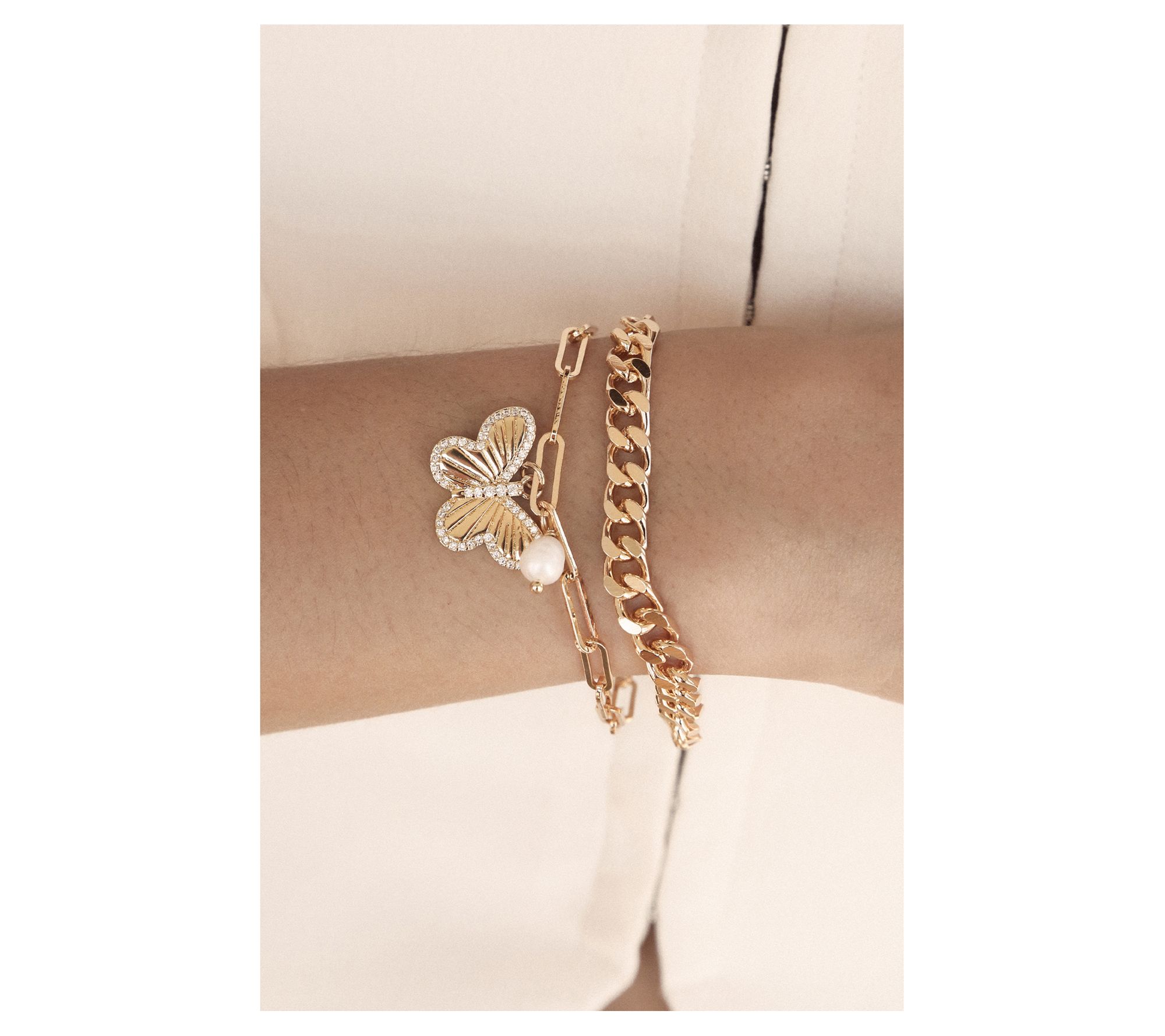 Delicate butterfly charms and lustrous cultured freshwater pearls meet sparkling cubic zirconia accents in this playful chain bracelet set. Layer both together for a whimsical look that brightens your day, or wear one at a time for subtle shine that complements any outfit -- office or weekend brunch. From Ettika.